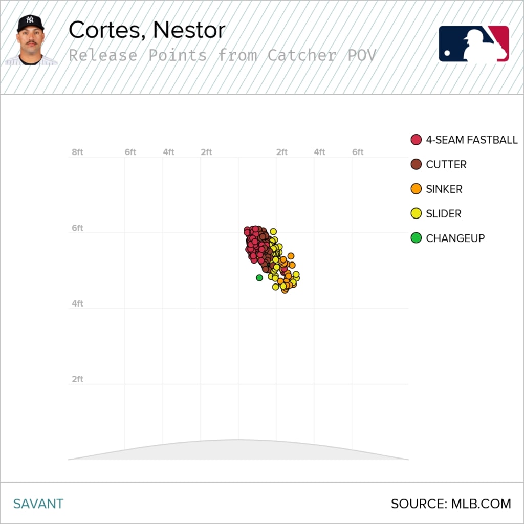 The difference between Cortes' highest and lowest vertical release points of the season is 1.69 feet. The difference between his most over-the-top and most sidearm horizontal release points is 2.69 feet.