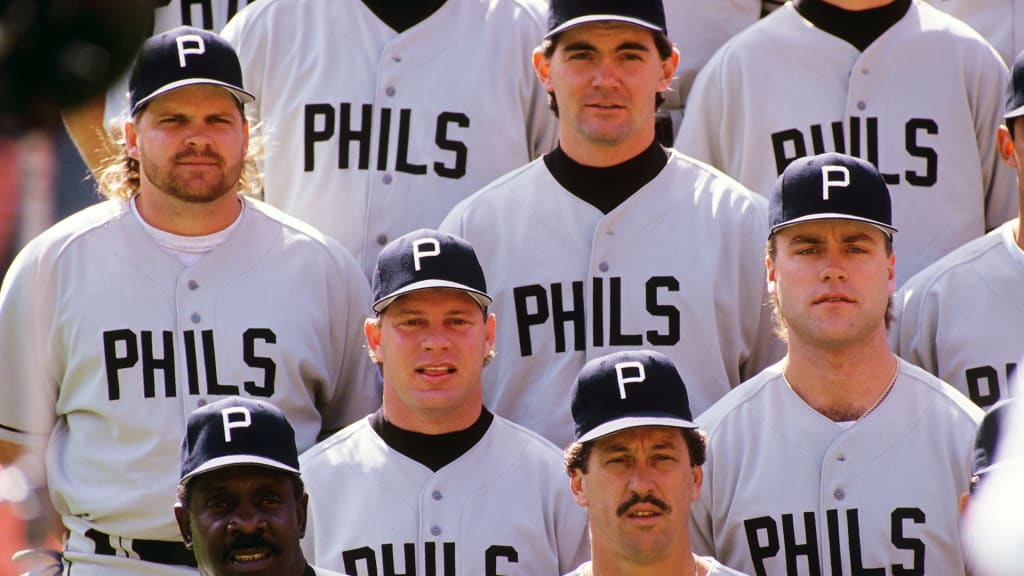 Familiar faces in a “PHILS” team photo include John Kruk, Terry Mulholland, Dave Hollins, Lenny Dykstra, John Vukovich and Mel Roberts. They weren’t even born in 1942. What gives?