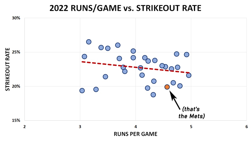 It could be that it is. But it can’t just be this, either. The two teams the Mets are tied with for most runs scored, the Angels and Brewers, have the sixth- and seventh-highest strikeout rate, respectively. Two of the teams with the three lowest strikeout rates, the Royals and White Sox, have scored the fewest and fourth-fewest runs. Meanwhile, the Yankees have baseball’s best hard-hit rate and the AL’s most runs per game.