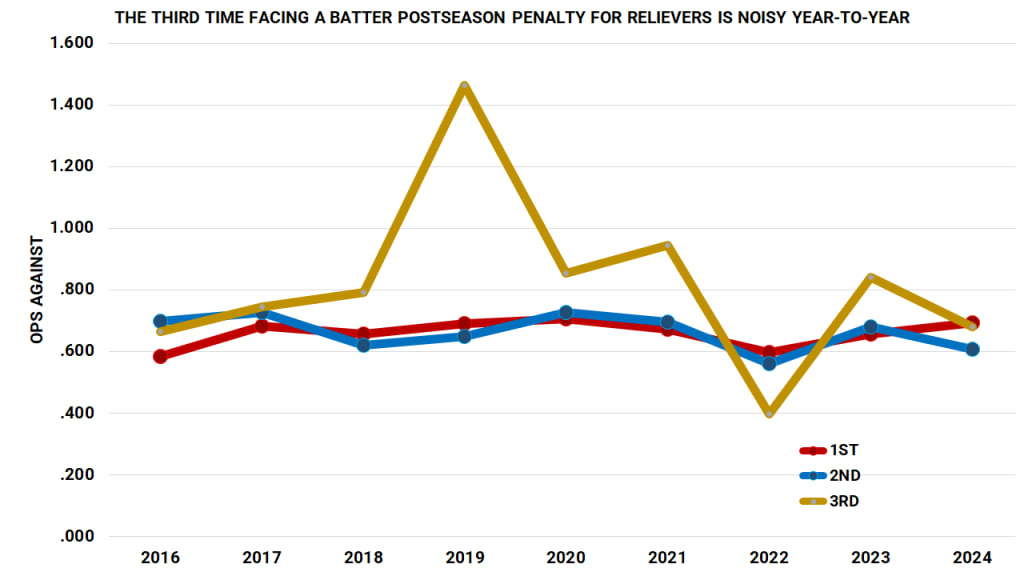 To be clear, the case here isn’t that relievers don’t have a harder time the more they face batters, as there’s compelling scientific evidence that they do. It’s just that we haven’t really seen it happening right now, this postseason, in 2024. And let's not forget: It’s not like leaving a starter in the third time through instead of going to that reliever yet again leads to outstanding outcomes, as Tanner Bibee found out against Giancarlo Stanton in Game 5.