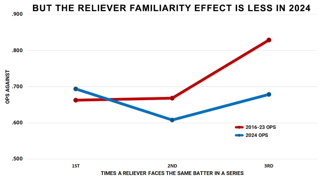 It’s come up a lot this month, and it’s true, clearly, if you look at most any time period in recent baseball history. For example, you’ve probably seen a version of this chart recently, showing that reliever effectiveness the third time facing a hitter in the same series plummets, to the tune of an increase of more than 180 points of OPS over the 2016-23 period.