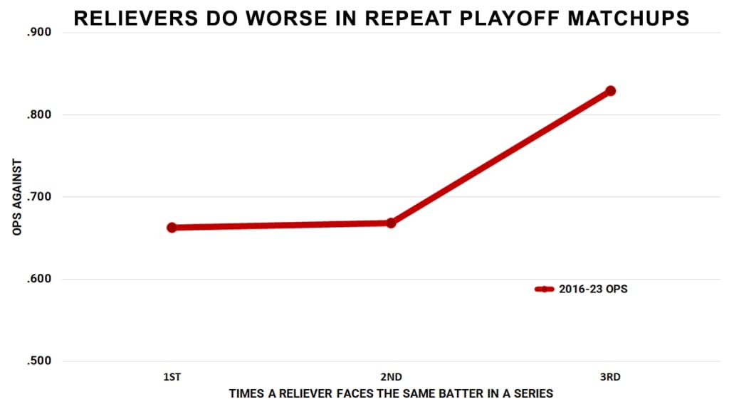 Initially, it would seem likely that it’s a one-year fluke, that we’ll look back next year and wonder what was happening in 2024. Except: It didn’t happen in 2022, either, when relievers facing a batter the third time in a series allowed an OPS of a mere .396, which was 200 points lower than the first time. You might remember David Robertson retiring Yordan Alvarez four times in the World Series (with three strikeouts!), as well as José Alvarado also getting Kyle Tucker to post an 0-for-4 in the Series.