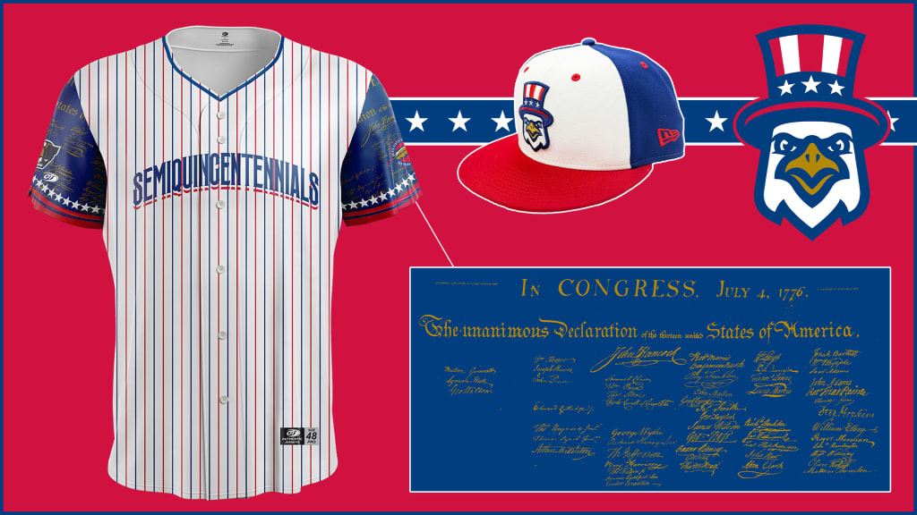 "The jersey still has pinstripes, but the pinstripes are alternating red and blue," said Hansen. "Specifically the exact shades of red and blue that are used in the American flag. So we kept those colors consistent throughout all of the logos. ... The other aspect of the jersey that's really neat is that, imprinted on both sleeves, there are the actual signatures from the Declaration of Independence."