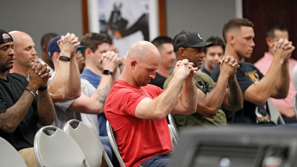 Ricky Kalmon, a mindset expert and motivational speaker, conducted exercises with the team’s players, coaches, field staff and members of the front-office baseball operations department in the Dugout Club at George M. Steinbrenner Field.