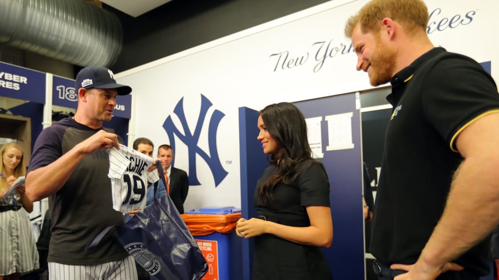 “You guys have beaten next door’s present, by the way,” Prince Harry told the Yankees before he posed for a photo with the team.