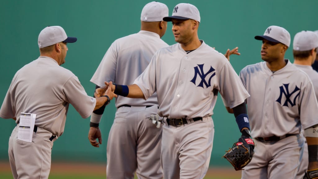 The “NY” migrated from the left sleeve to the left breast of the Yankees’ home uniforms from 1912-15, albeit in a larger version than is currently worn today. When the Yanks helped celebrate Fenway Park’s centennial in 2012, Derek Jeter led his team onto the field in gray uniforms sporting the old version of the logo.