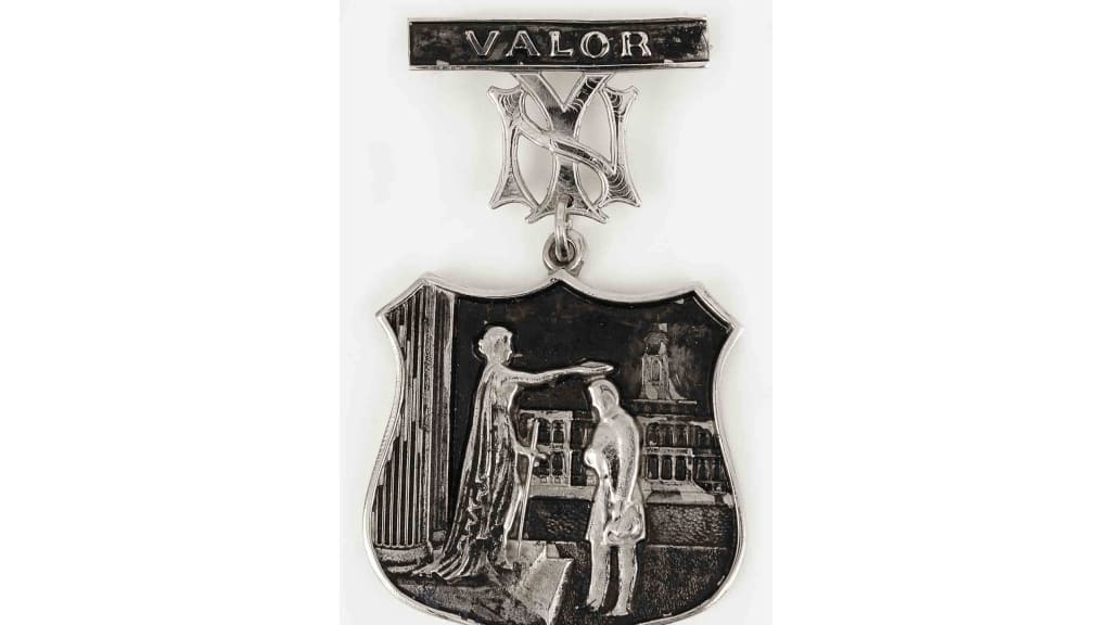 McDowell recovered and was awarded the NYPD’s Medal of Valor, which prominently featured the interlocking “NY” symbol above a silver shield, depicting a woman placing a laurel wreath on a policeman’s head.