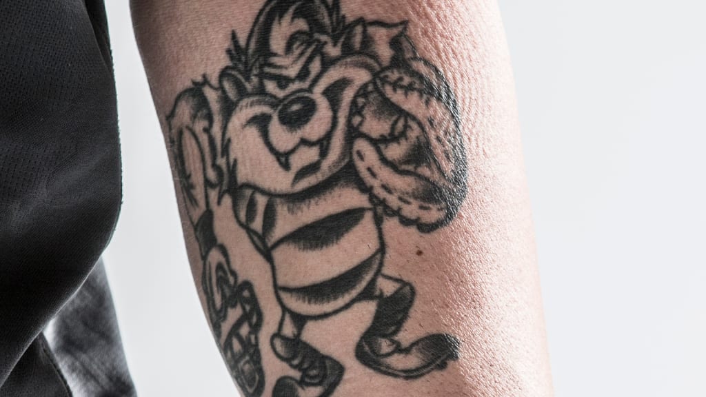 My first year in the big leagues, I had a pretty good run for a second there, and we were playing here in Arizona against the Diamondbacks. It was the first time my wife was able to see me in the big leagues. She made this huge sign that said, “Yazmanian Devil tearing it up.” That night, I hit a homer. It kind of stuck for a little bit because she came on the TV and fans saw it. The next year, I was like, why not? Let’s own it. I got the Tazmanian Devil tattoo with catcher's gear on it. I thought it was pretty cool, the fact she was able to come up with a nickname that stuck.