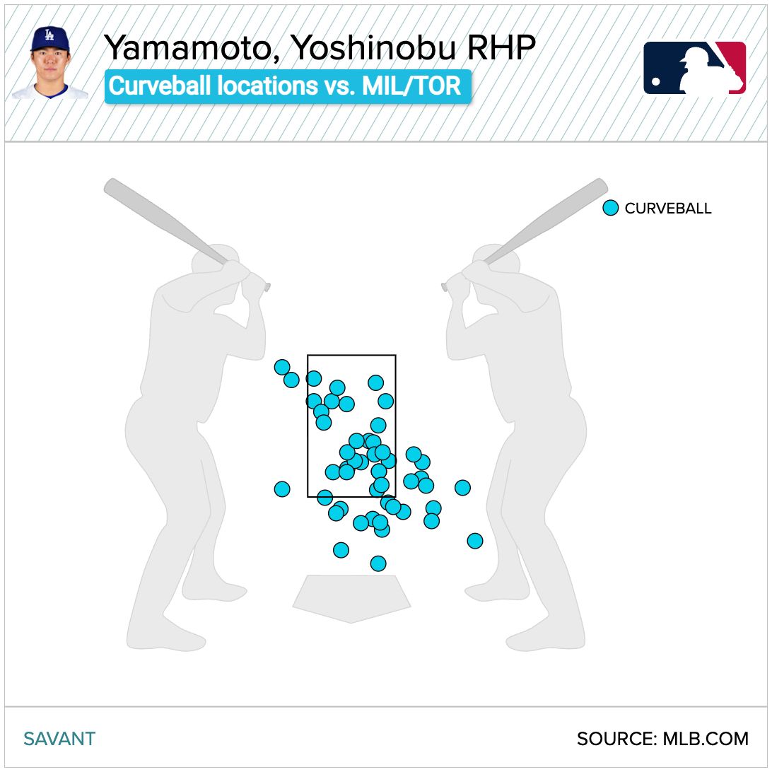 Well over half of Yamamoto's curveballs in those two games, 58%, were in the strike zone. Similar to how his edge percentage was unusually high for a splitter, that in-zone percentage is very high for a curveball. (Just look at Yamamoto's teammate Blake Snell for a contrasting example, whose curveball is down and out of the zone the vast majority of the time in an effort to force hitters to swing over the top.)
