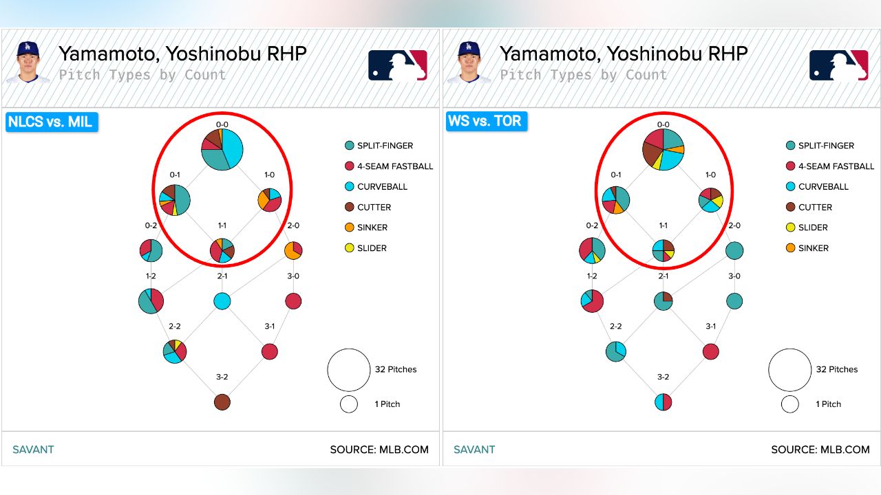 Look at Yamamoto's pitch selection to start at-bats against the Brewers and Blue Jays, and even just his pitch selection within all early counts: