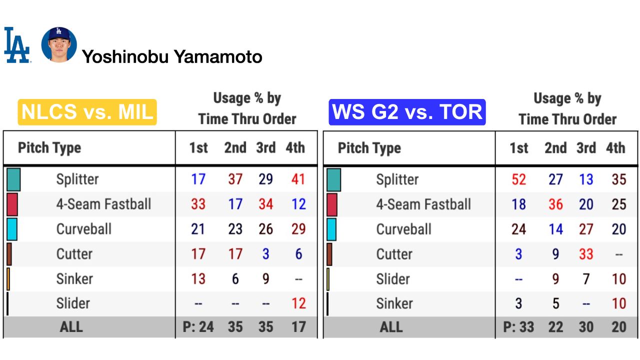 \n\n","providerName":"Twitter","providerUrl":"https://twitter.com","thumbnail_url":null,"type":"oembed","width":550,"contentType":"rich"},{"__typename":"Markdown","content":"With that sharp movement, much like his splitter, Yamamoto's curveball can generate both strikeouts and ground balls. Strikeouts get you through a dangerous lineup like the Blue Jays', and ground balls can get you deep into a game.\n\nEight of Yamamoto's 15 strikeouts across his two complete games came on curveballs and splitters. So did 16 ground-ball outs. Yamamoto has three games this season in which he recorded 10 or more outs on grounders, and two of those were his NLCS and World Series complete games. That was largely thanks to his splitter and curve.","type":"text"},{"__typename":"Video","contentDate":"2025-10-26T03:40:31.619Z","preferredPlaybackScenarioURL({\"preferredPlaybacks\":\"mp4AvcPlayback\"})":"https://mlb-cuts-diamond.mlb.com/FORGE/2025/2025-10/25/e84b3239-b48dde68-6f898f27-csvm-diamondgcp-asset_1280x720_59_4000K.mp4","type":"video","description":"Statcast measures the velocity and induced vertical break of some of Yoshinobu Yamamoto's nastiest pitches in his Game 2 complete game","displayAsVideoGif":false,"duration":"00:01:01","slug":"yoshinobu-yamamoto-s-nastiest-pitches-in-game-2","tags":[{"__typename":"GameTag"},{"__typename":"TeamTag","slug":"teamid-119","title":"Los Angeles Dodgers","team":{"__ref":"Team:119"},"type":"team"},{"__typename":"PersonTag","slug":"playerid-808967","title":"Yoshinobu Yamamoto","person":{"__ref":"Person:808967"},"type":"player"},{"__typename":"TaxonomyTag","slug":"vod","title":"vod","type":"taxonomy"},{"__typename":"TaxonomyTag","slug":"player-tracking","title":"Statcast","type":"taxonomy"},{"__typename":"TaxonomyTag","slug":"game-action-tracking","title":"game action tracking","type":"taxonomy"},{"__typename":"TaxonomyTag","slug":"alexa","title":"alexa","type":"taxonomy"},{"__typename":"TaxonomyTag","slug":"imagen-feed","title":"Imagen feed","type":"taxonomy"},{"__typename":"TaxonomyTag","slug":"postseason","title":"postseason","type":"taxonomy"}],"thumbnail":{"__typename":"Thumbnail","templateUrl":"https://img.mlbstatic.com/mlb-images/image/upload/{formatInstructions}/mlb/ppswfavklepm493xjpib"},"title":"Yoshinobu Yamamoto's nastiest pitches in Game 2","relativeSiteUrl":"/video/yoshinobu-yamamoto-s-nastiest-pitches-in-game-2"},{"__typename":"Markdown","content":"**2) He changes his patterns**\n\nIf you're going to throw a complete game, though, that means you have to get through the opposing lineup at least three, probably four times. And you usually can't do that if you throw the same pitches over and over again.\n\nYamamoto's complete game efforts have been about a lot more than his splitter and curveball.\n\nThe times through the order penalty is well documented in baseball -- the more times that hitters see a pitcher in a game, the harder they hit him. In the playoffs these days, starting pitchers often don't even get to face the other team's best hitters a third time, let alone a fourth time.\n\nHere's how Yamamoto combats that: From one time through the order to the next, his pitch mix never looks the same.","type":"text"},{"__typename":"Image","caption":null,"contextualCaption":null,"contextualAspectRatio":"raw","credit":null,"contentType":null,"format":"jpg","templateUrl":"https://img.mlbstatic.com/mlb-images/image/upload/{formatInstructions}/v1761856932/mlb/ahrjj4bxnfrufd4sbxpa","type":"image"},{"__typename":"Markdown","content":"You can now see a breakdown of each pitcher's times-through-the-order pitch usage on the Baseball Savant Gamefeed. Those are Yamamoto's for his two playoff complete games.\n\nIn his NLCS complete game against the Brewers:\n\n* Yamamoto started the game with a balanced pitch mix, working in his fastball, curveball, splitter, cutter and sinker.\n* By the time he got to the third time through the Milwaukee order, when the damage usually comes, he was able to lean on his big three pitches -- his fastball, splitter and curve -- because he hadn't showed any one of them too much early in the game.\n* He even mixed in a surprise late in the game: his slider, which he didn't use until his final time through the order.\n* And his most-used pitch was never the same back-to-back times through the order -- he alternated between his four-seam fastball and his splitter as he went through the game.","type":"text"},{"__typename":"OEmbed","html":"