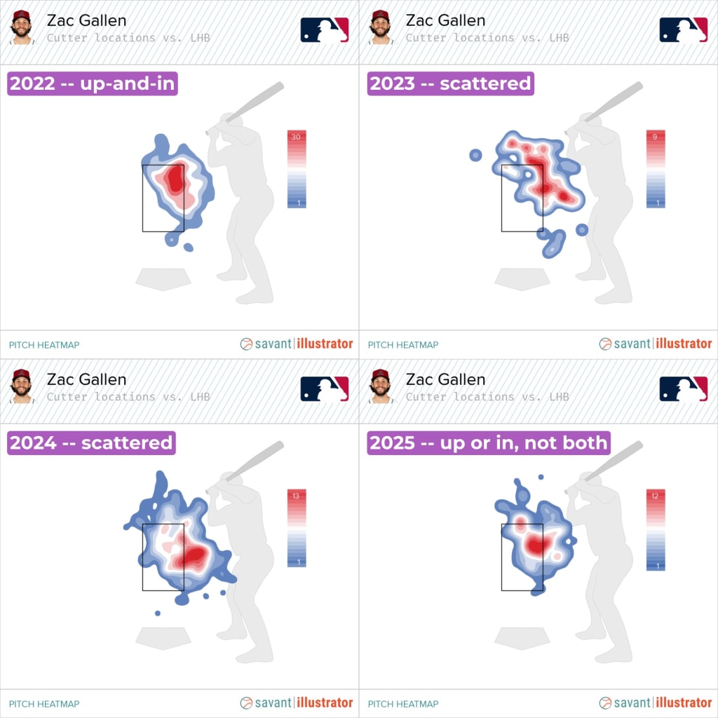 A lot of the difference probably comes down to command -- as great as Gallen's command is overall, his cutter locations have seemed much spottier since that 2022 season, including a bunch to lefties in 2025 that just didn't quite get up and in enough. It was more one or the other -- either up, but out over the plate, or in, but not elevated to the top of the zone.