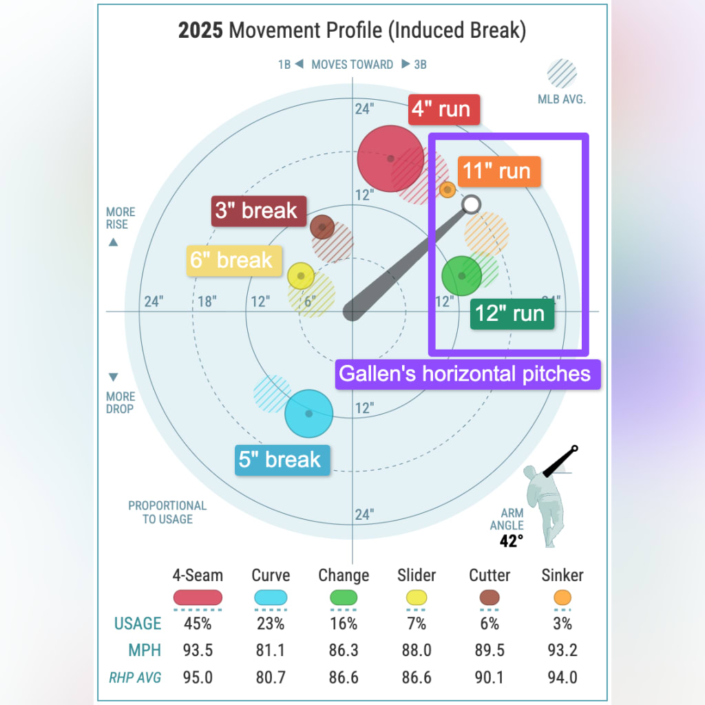 His sinker and changeup are the only horizontal pitches he has, and he doesn't throw a ton of changeups to righties. Now that he has a half-season of throwing the sinker under his belt, Gallen could try to use it even more in 2026. Maybe he even signs with a team with a good pitching lab that, for example, makes a tweak to his grip to help him get a little extra movement.