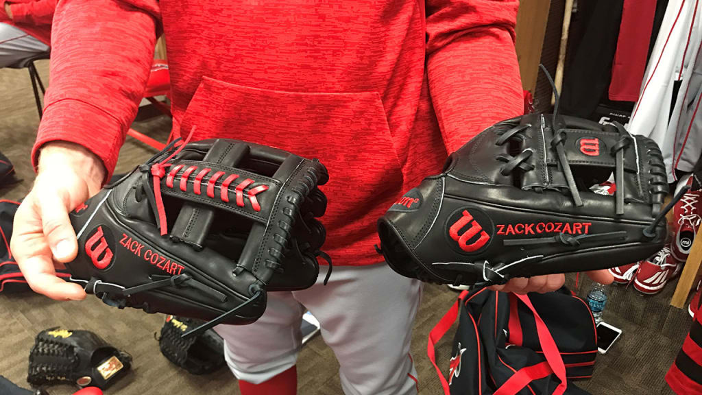 Cozart received two new gloves from Wilson on Wednesday morning, both black 11 3/4-inch models with his name in red stitching, but with different webbing.