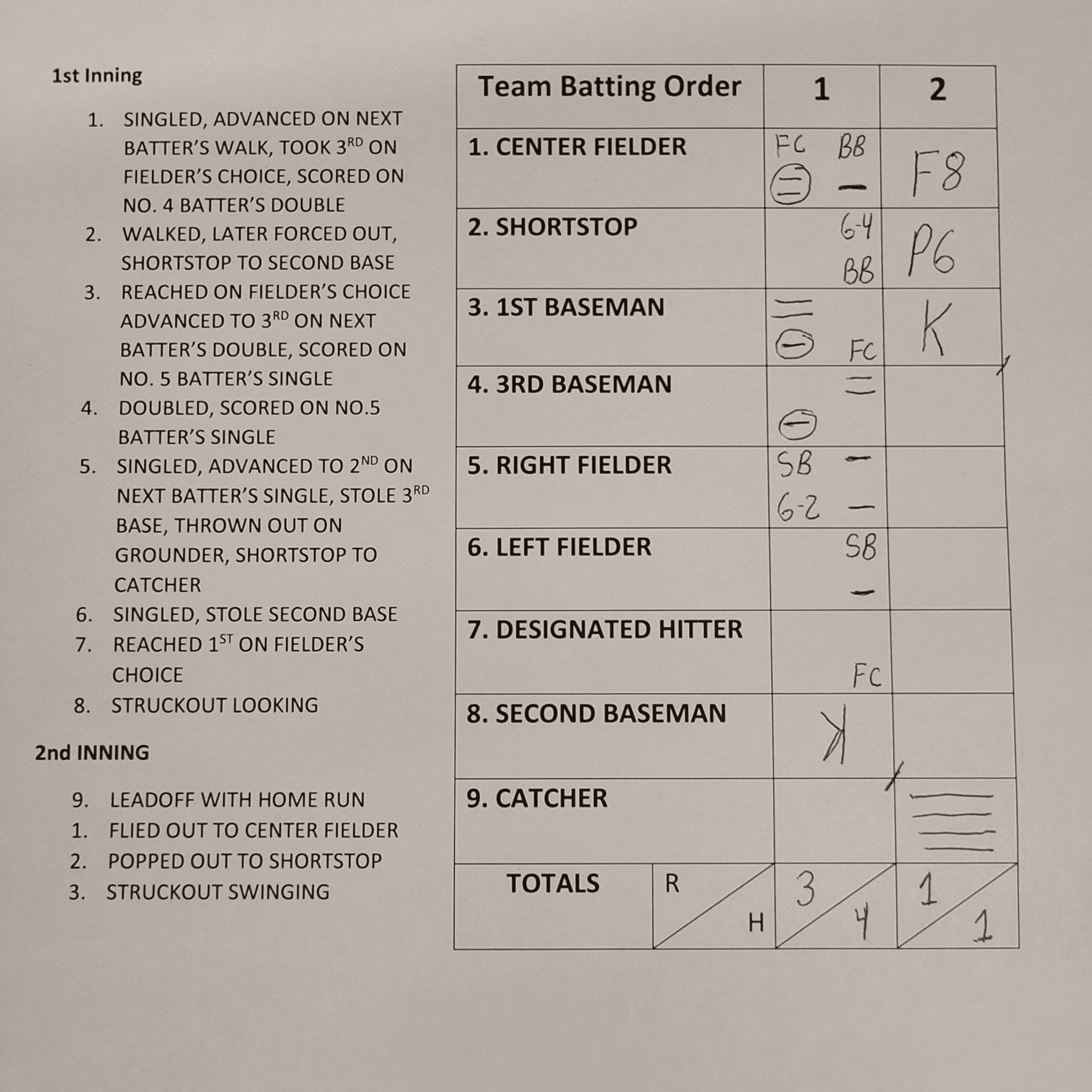 If the hitter grounds out to shortstop, for example, write in "6-3," which shows the shortstop threw him out at first base. If the hitter flies out to left field, write a "7."