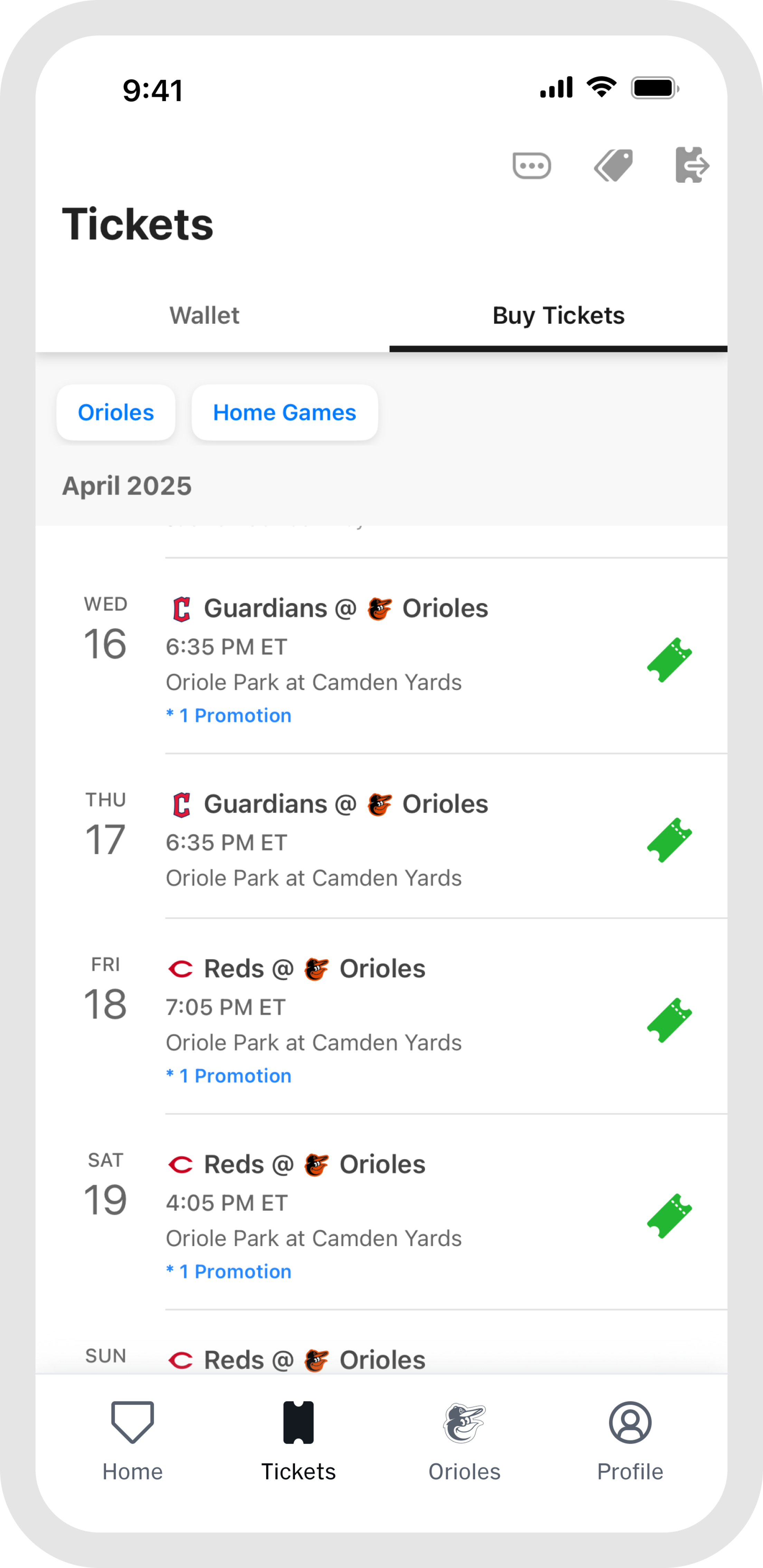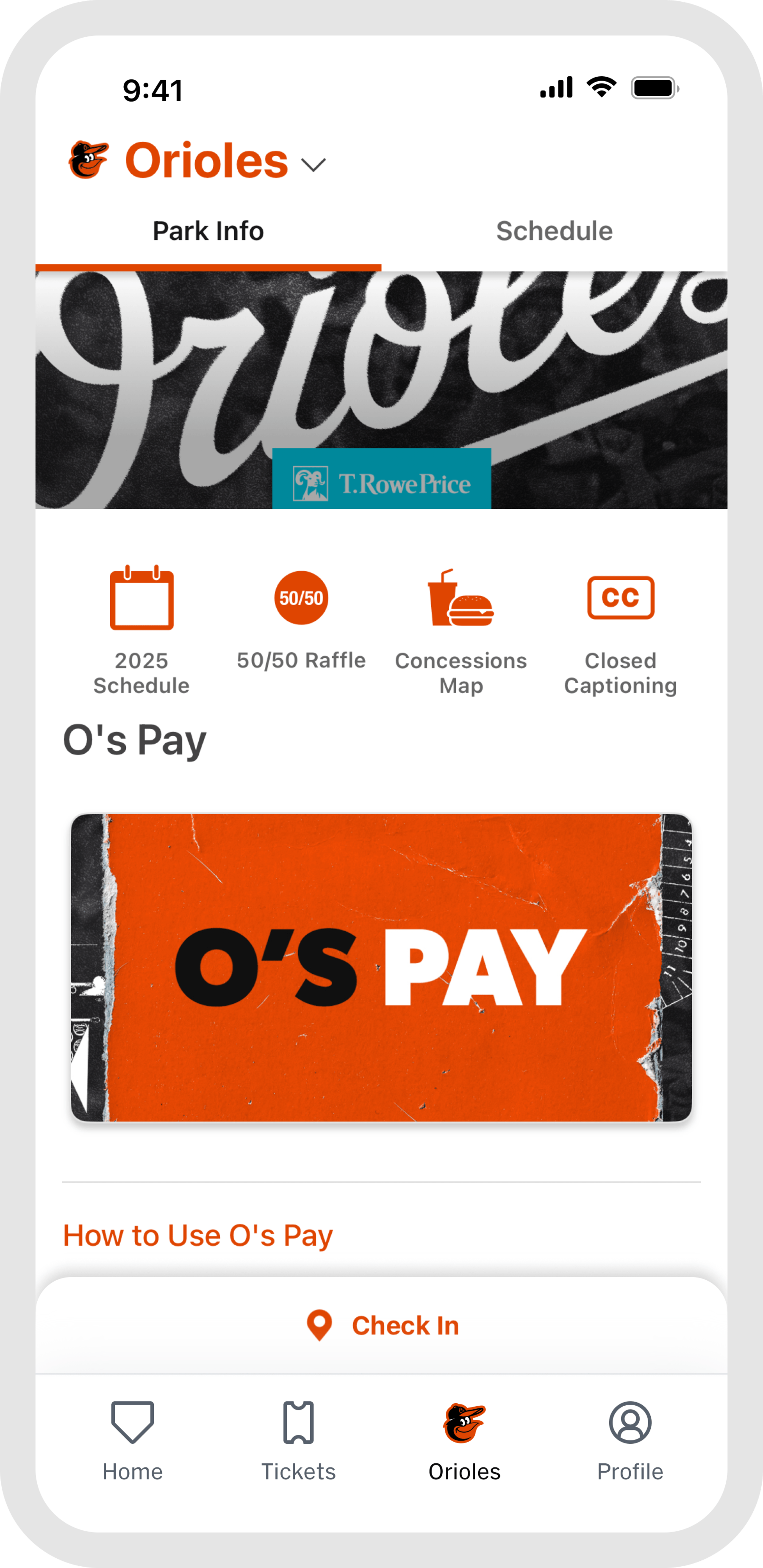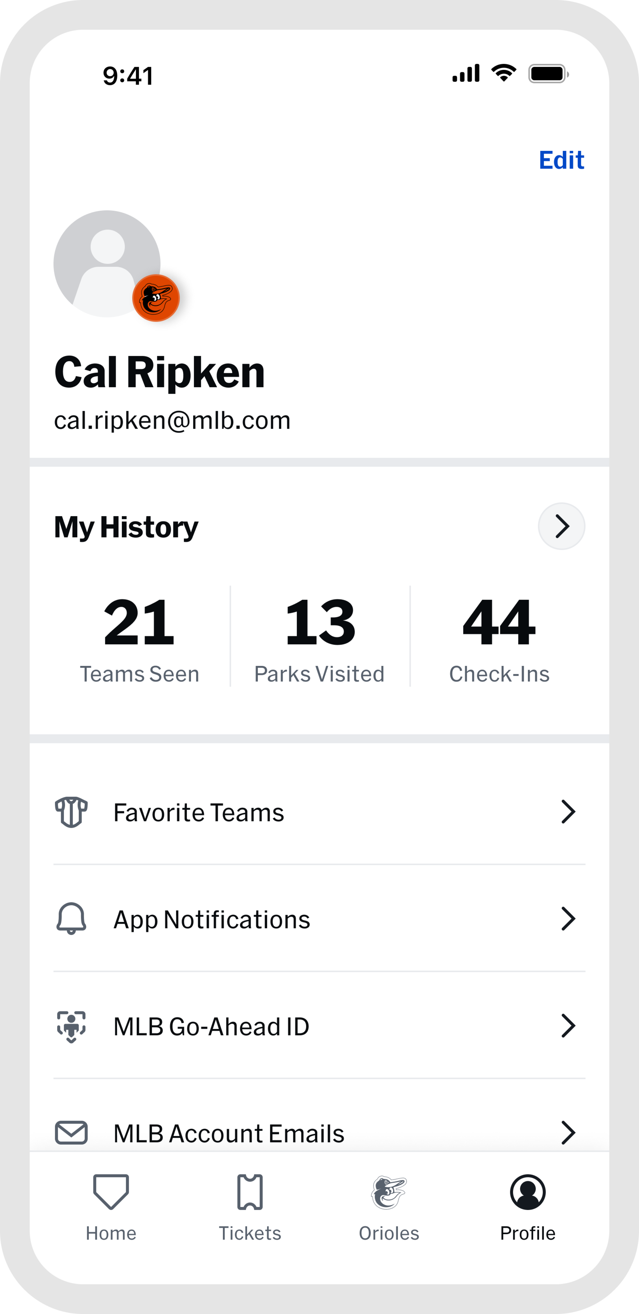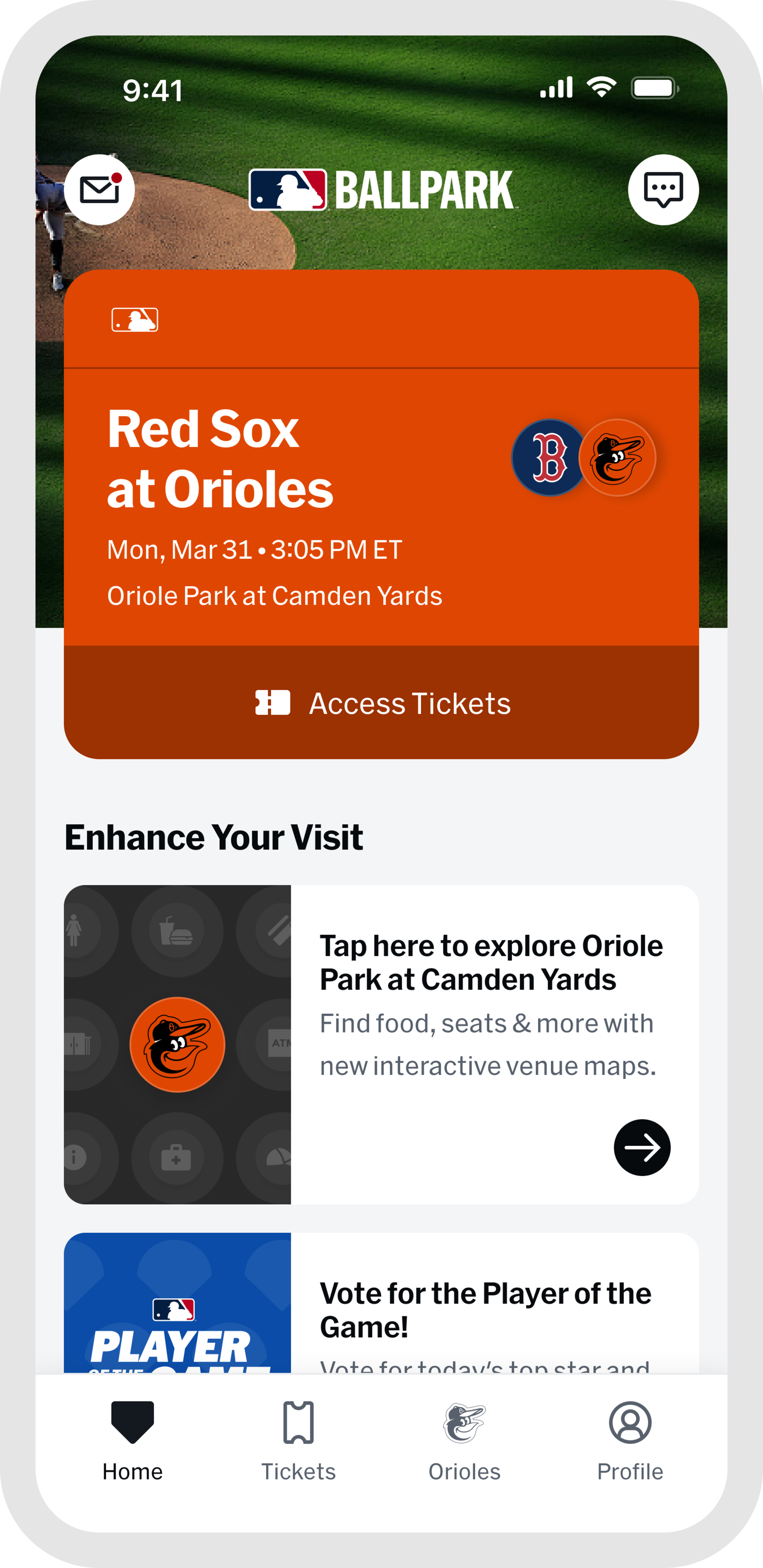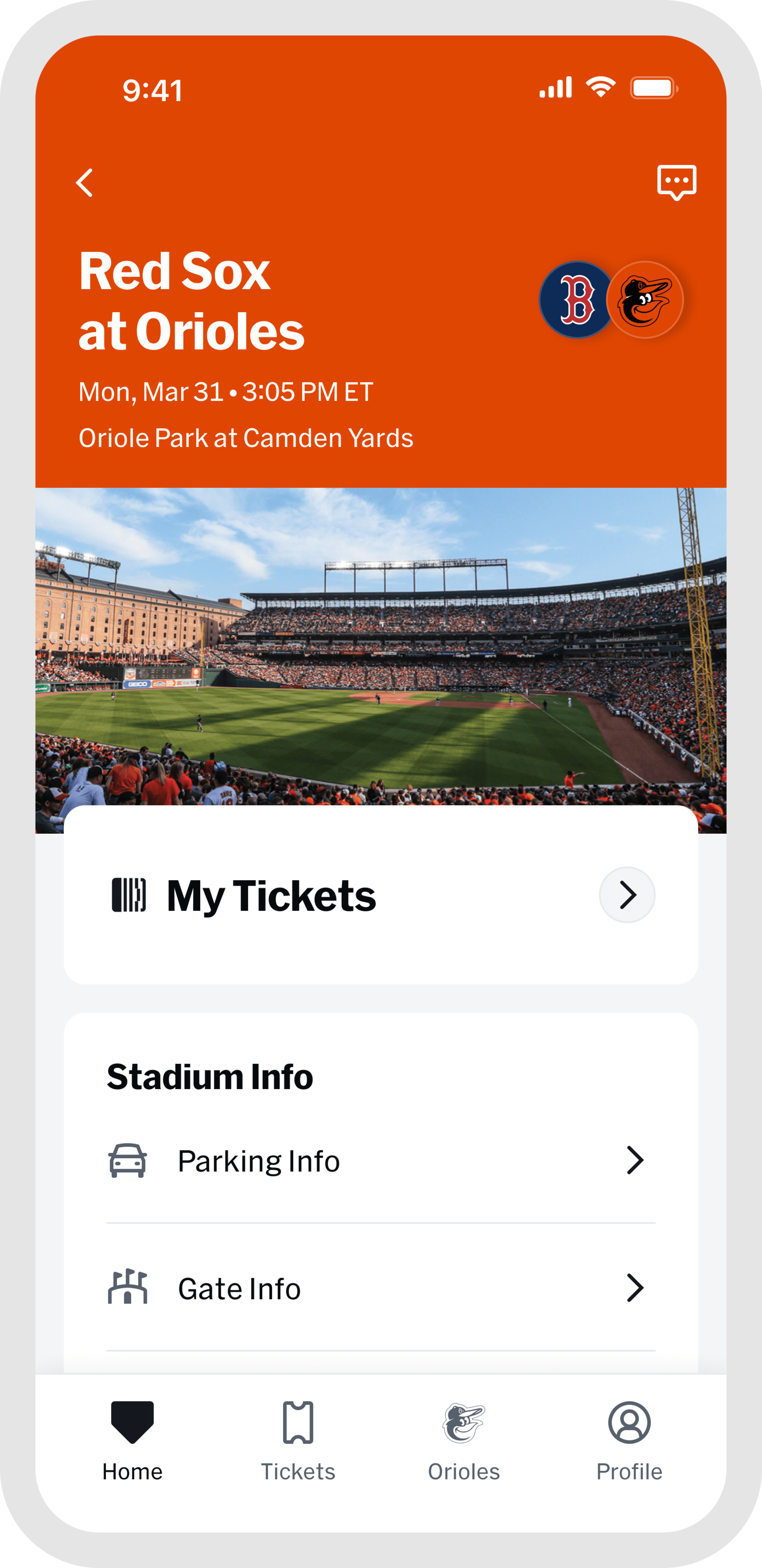 Once you arrive, the "Home" and "Orioles" tabs become your go-to resource for venue details and features that enhance your gameday experience. Capture and preserve your ballpark memories by tapping "My History" within the "Profile" tab.