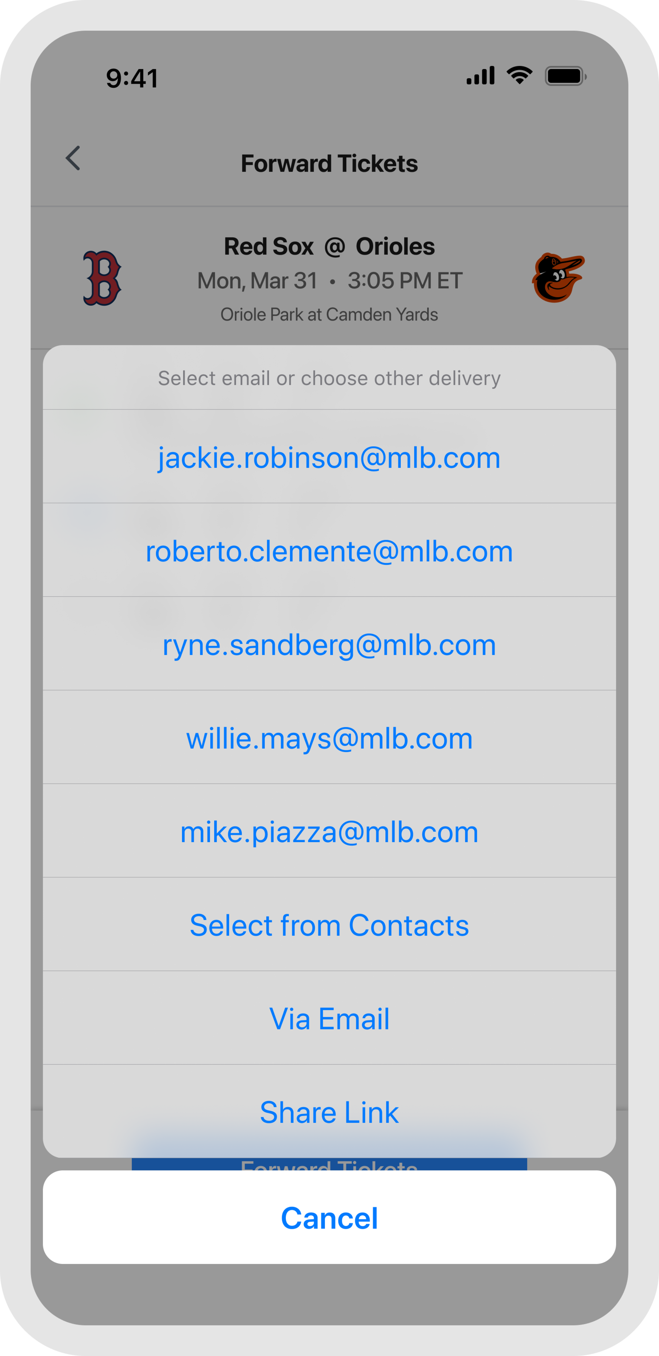 If you choose to forward via email, you can enter an email address manually, select a contact from your device's address book, or quickly send tickets to friends you've recently forwarded to by tapping on their email. Your friend will receive a notification letting them know you've sent them mobile tickets.