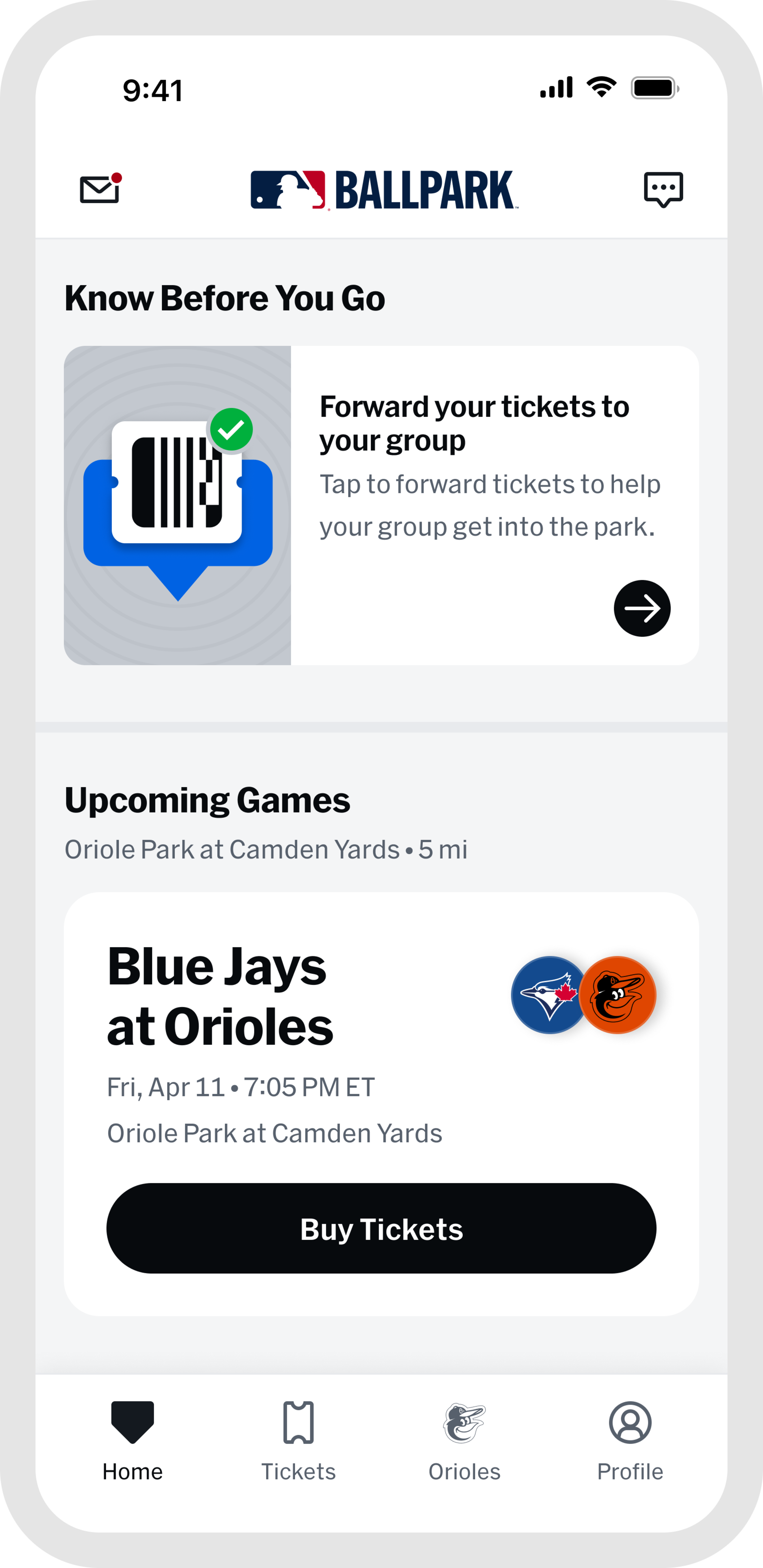 The MLB Ballpark app streamlines your gameday experience by keeping your digital tickets secure and accessible on your smartphone while helping you plan the perfect gameday. Easily manage, organize, and share your tickets with friends or family for smooth ballpark entry. Browse the full season schedule to find games with special promotions, and use detailed ballpark maps to locate your seats, discover the best food spots, and explore all the amenities Oriole Park at Camden Yards has to offer.