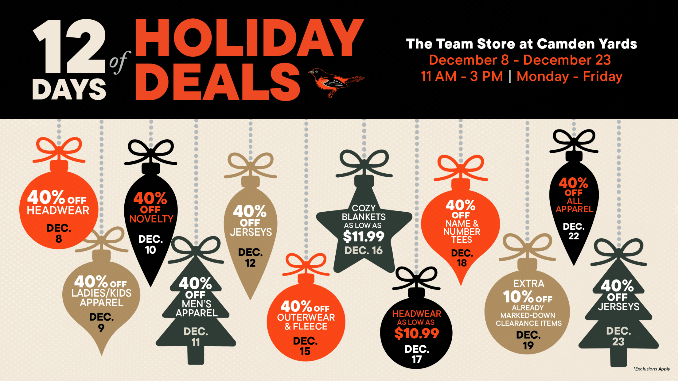 Take 40% off all City Connect Merchandise from Jerseys, Hats, Apparel and more! Stop by any Team Store location throughout Oriole Park to find all your City Connect gear! Styles Vary by Location.