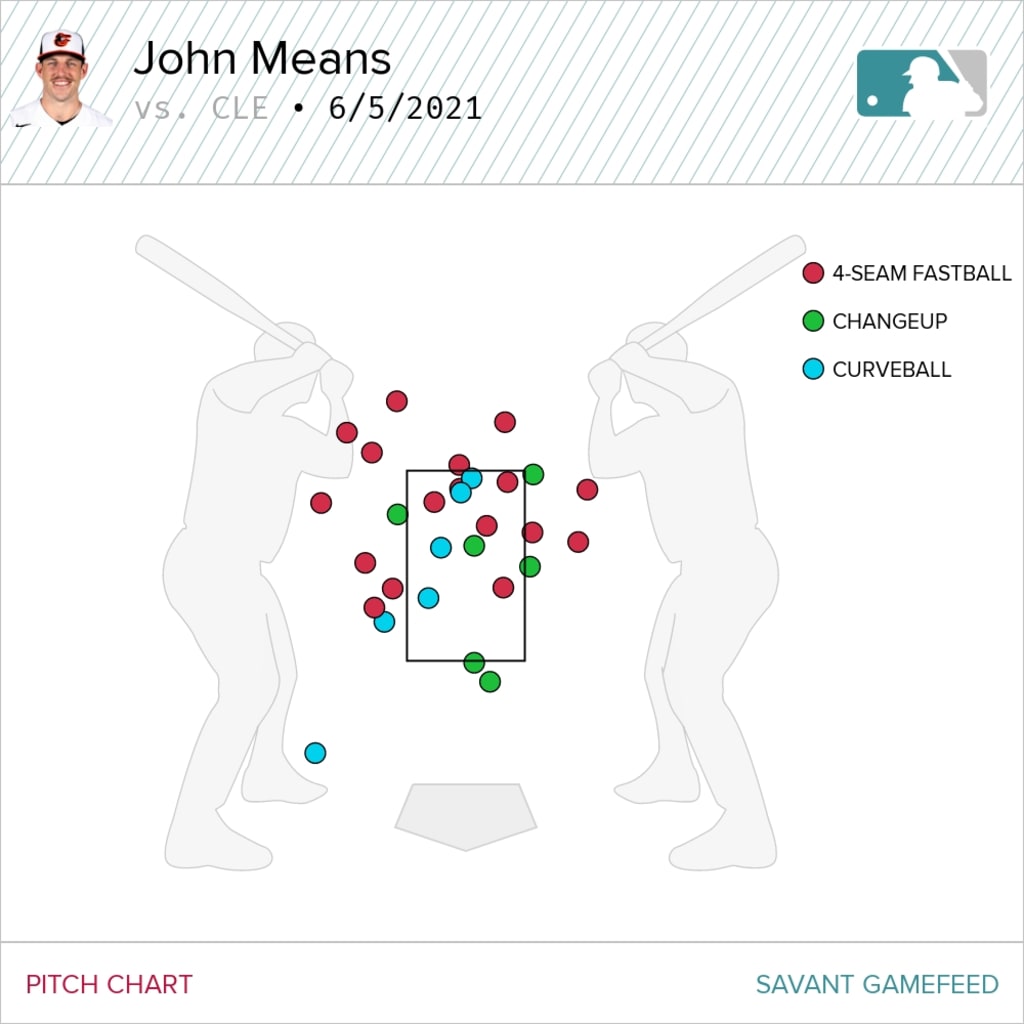 Means’ average pitch velocity remained consistent, hovering 1 mph faster than his yearly average on all three of his pitches (four-seam fastball, changeup and curveball). His command, however, was lacking. His four-seam fastball, his most-used pitch this season at 51.4 percent, missed the zone 14 out of the 19 times he threw the pitch.