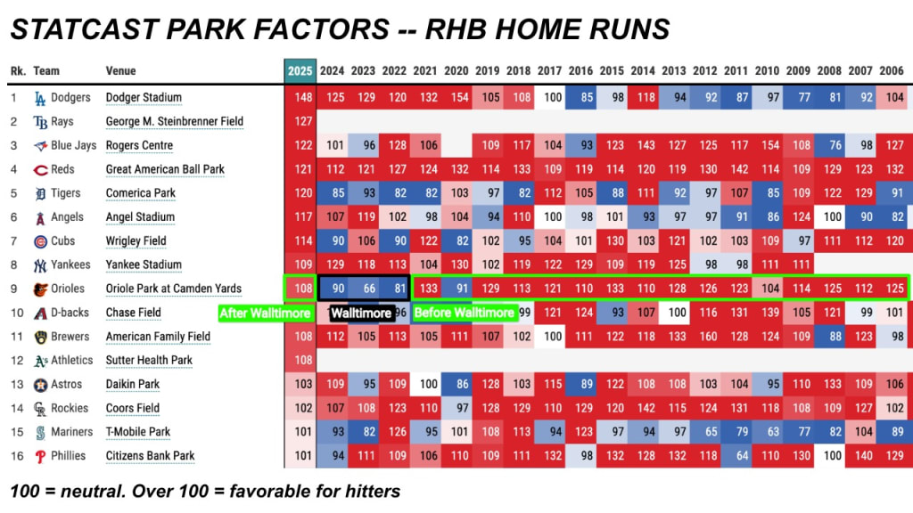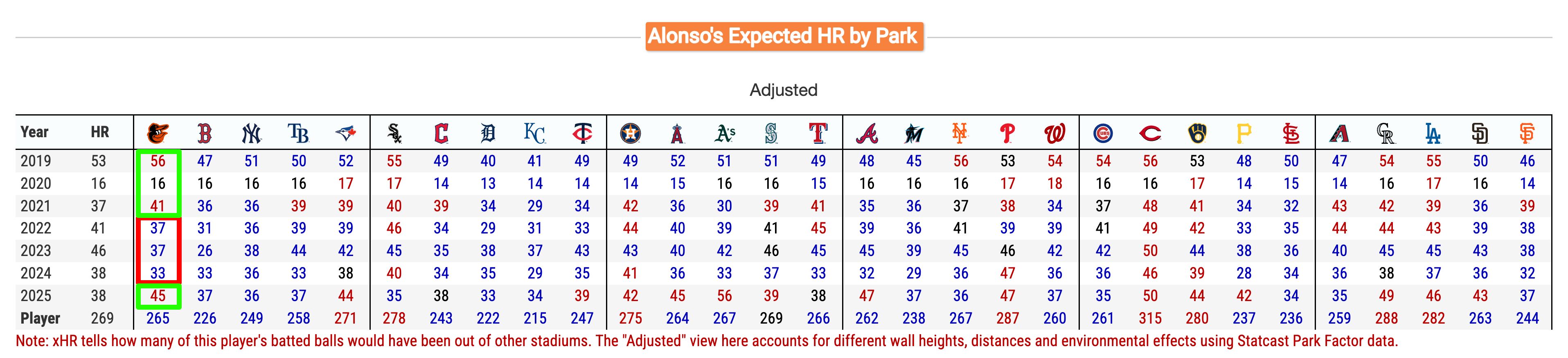 Alonso hit 38 home runs in 2025. If he had played all of his games at Camden Yards, he would have had 45 home runs -- a seven-homer gain from the ballpark post-Walltimore.