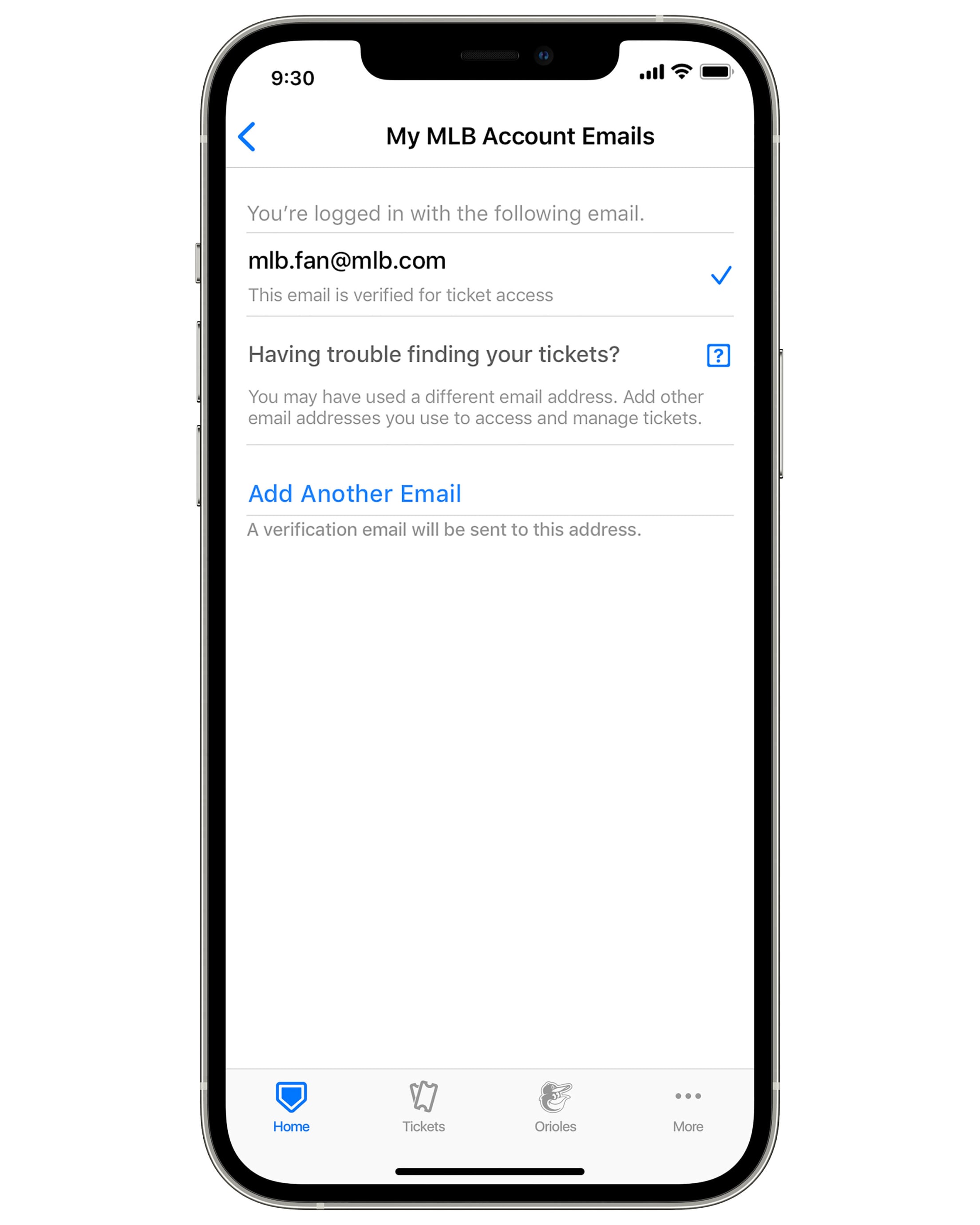 - You may need to verify your email address if this is your first time accessing your tickets in the MLB Ballpark app. You can verify your email address by tapping the Settings gear from the top right hand corner of the Today tab, tapping on MLB Account, and tapping to send the verification email.