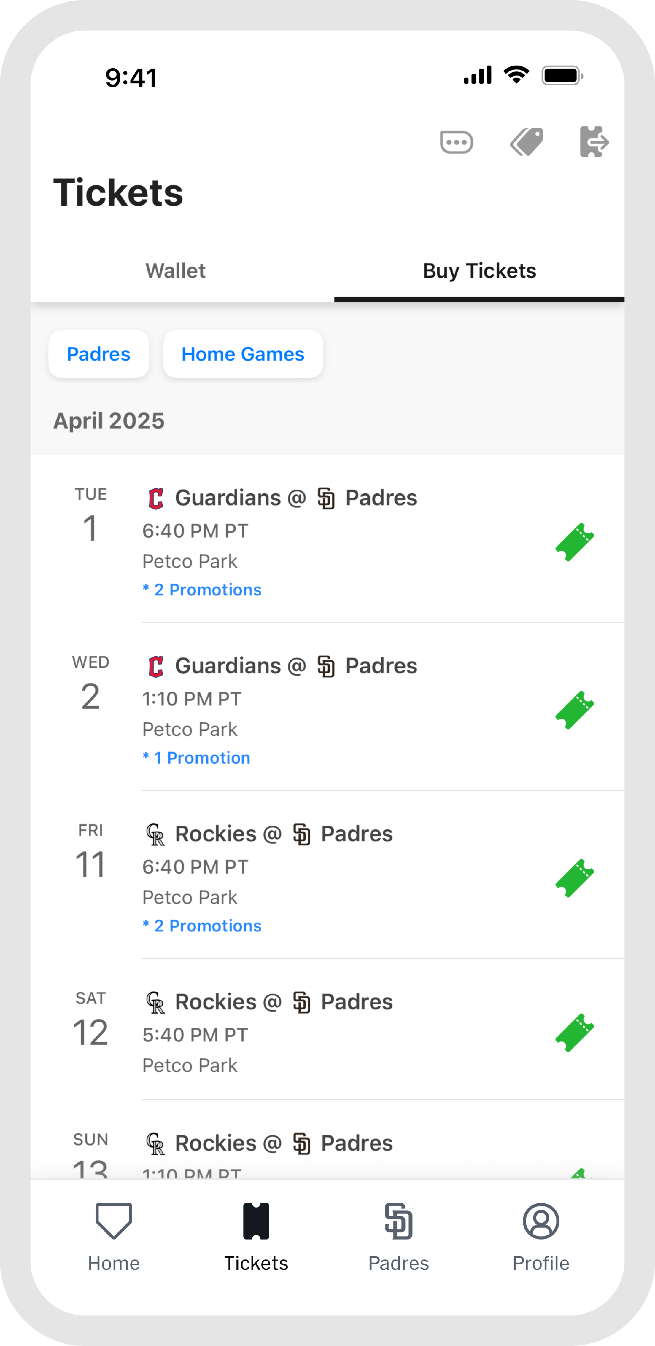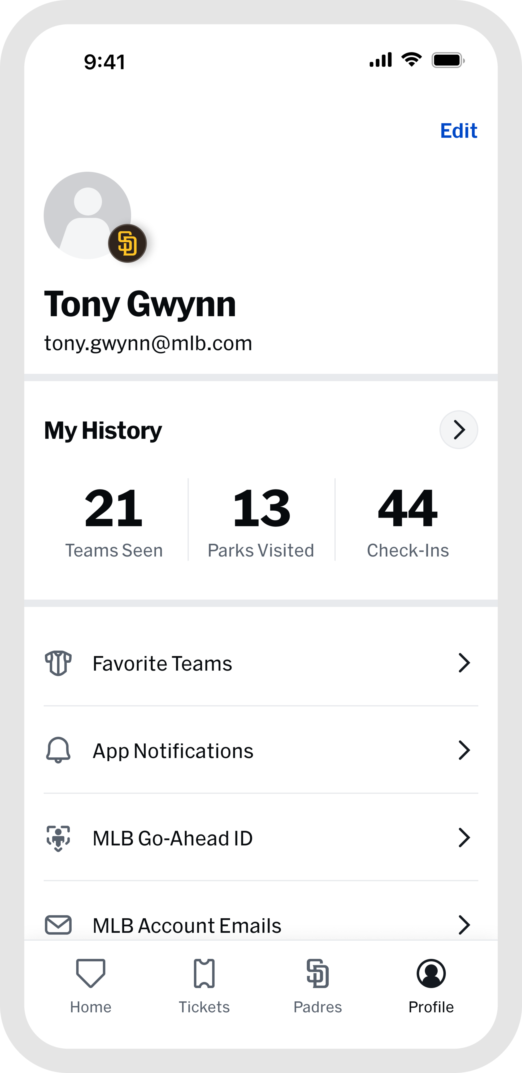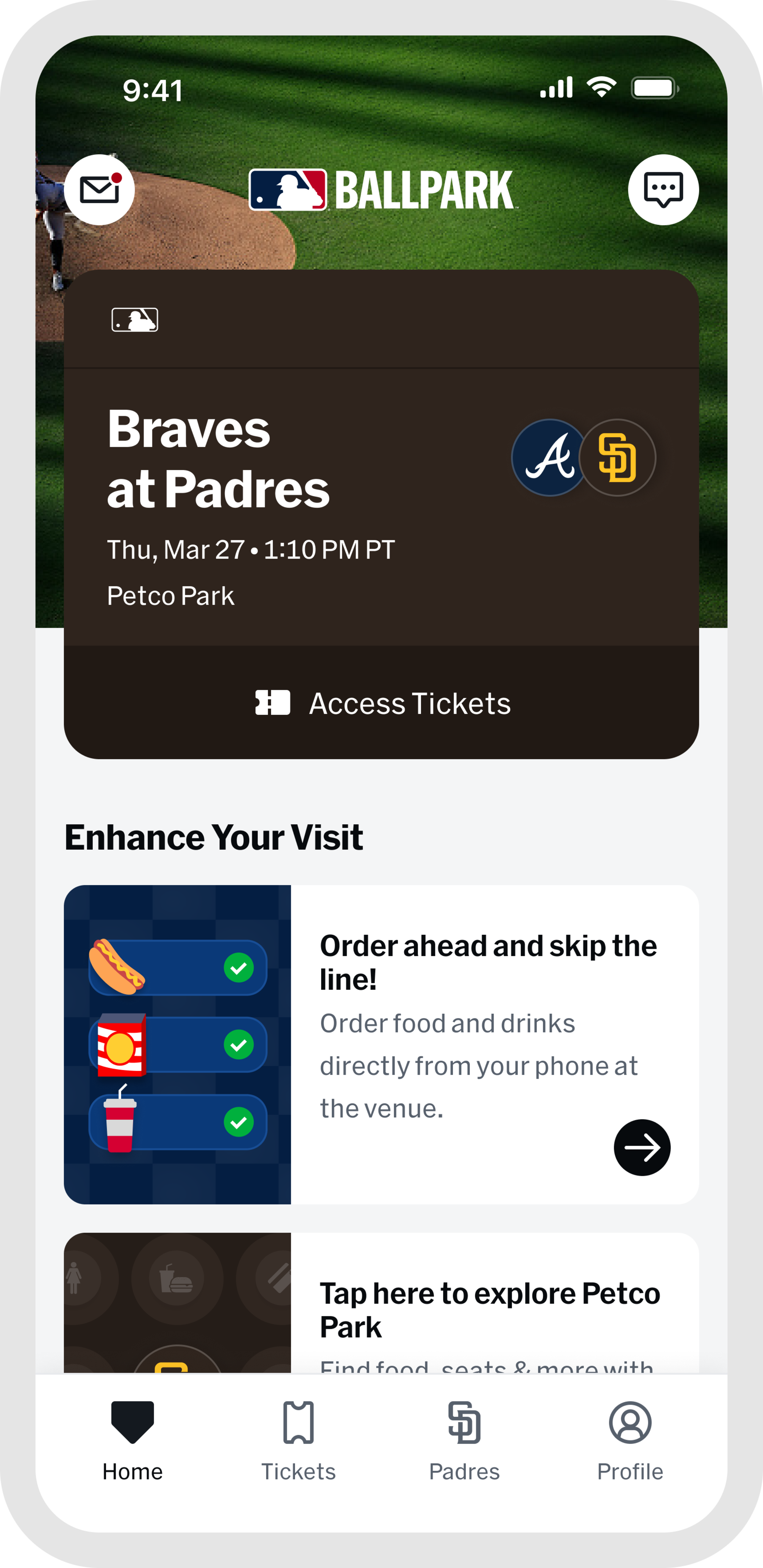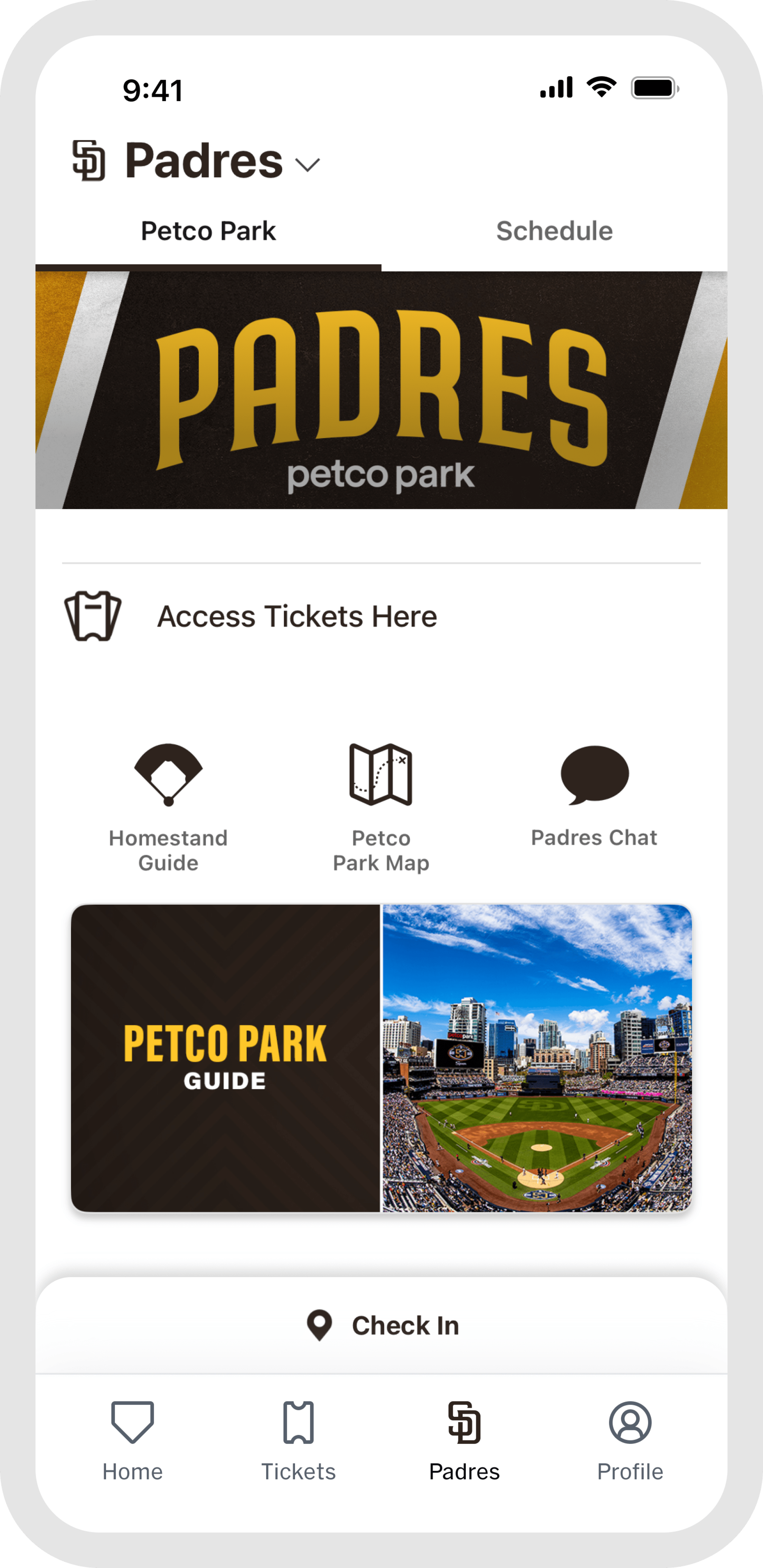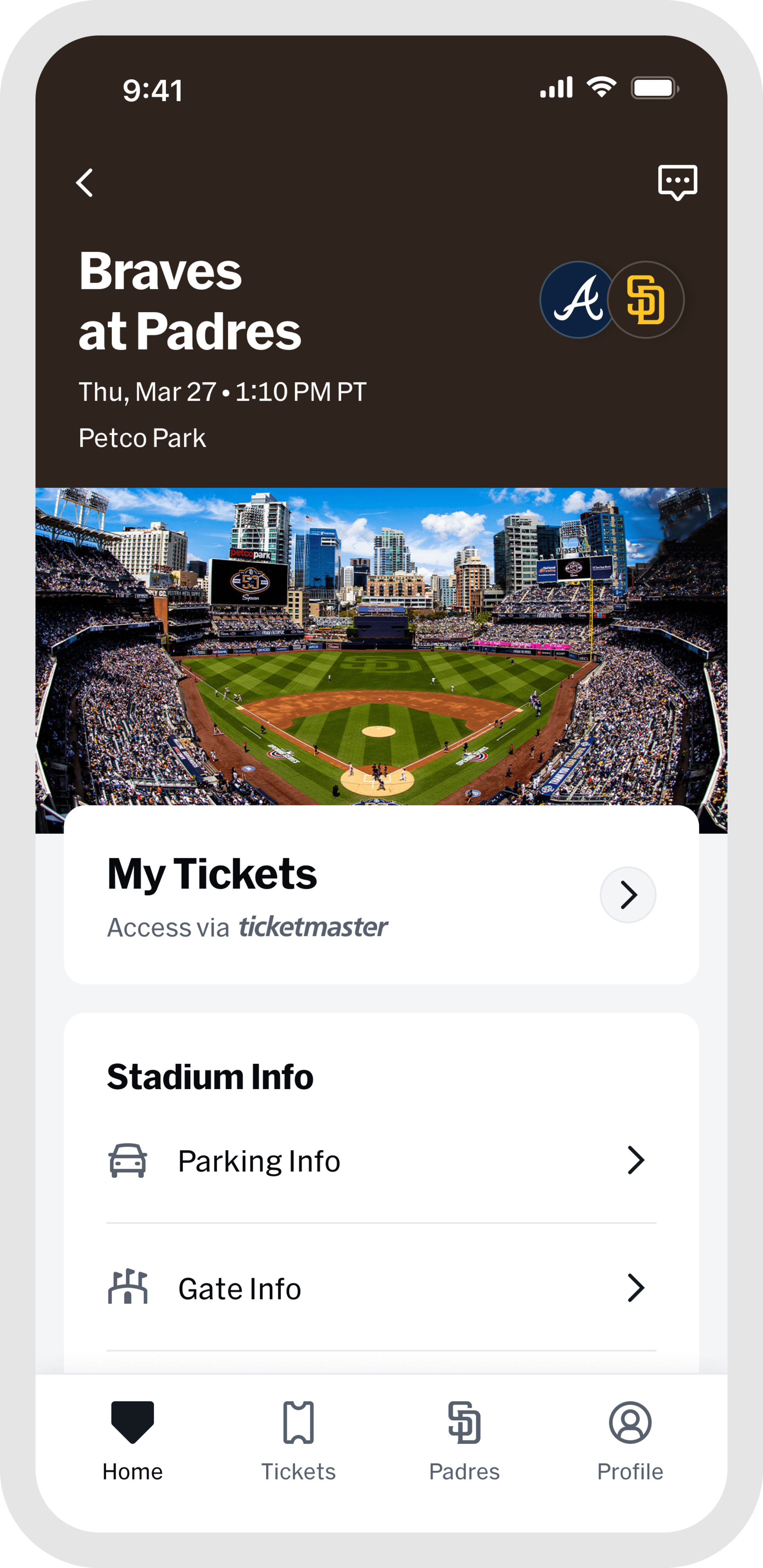 Once you arrive, the "Home" and "Padres" tabs become your go-to resource for venue details and features that enhance your gameday experience. Capture and preserve your ballpark memories by tapping "My History" within the "Profile" tab.