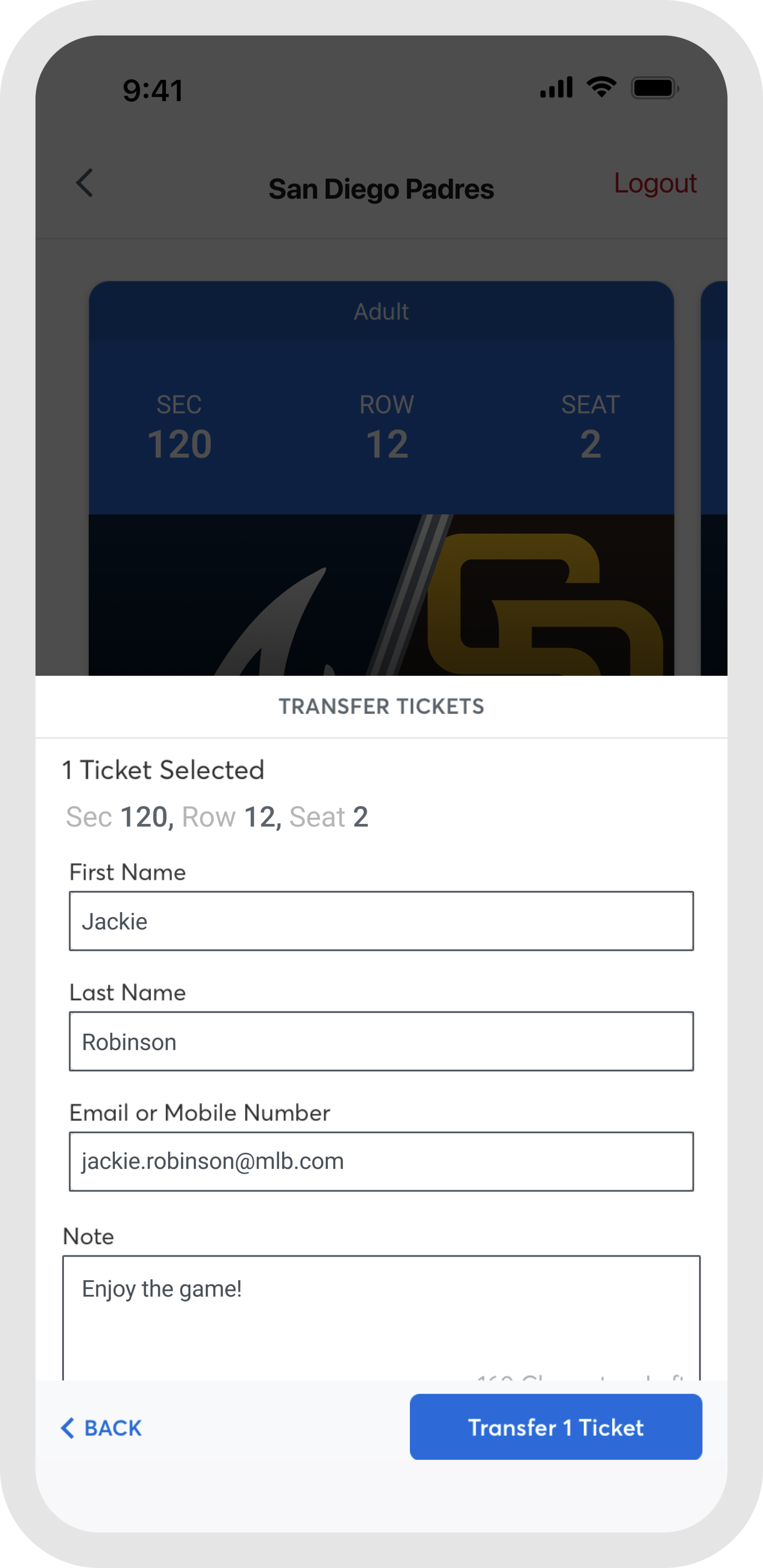 Forward a ticket by navigating to "Wallet" within the "Tickets" tab and selecting the game you're attending. From the list of tickets for that game, tap the forward button and choose which tickets you'd like to send.