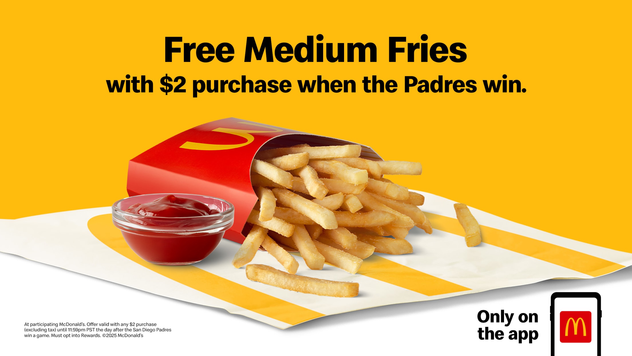Padres fans can get a free medium fries with $2 purchase the day after the game when the Padres win! Only available on the app at participating McDonald’s locations.