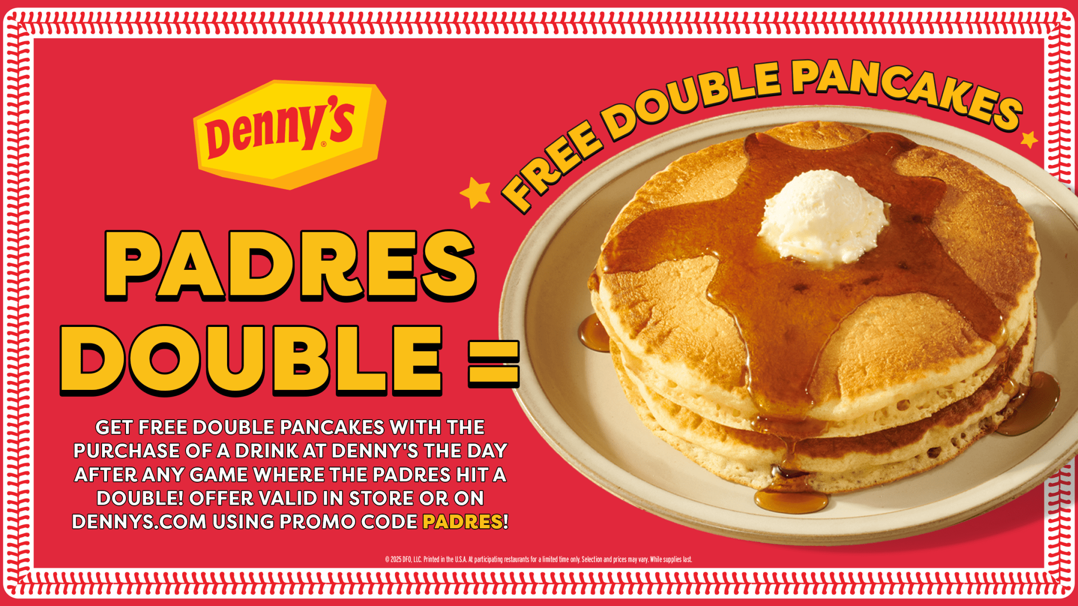 When a double is hit during a Padres home game, Denny’s will be giving away 2 free pancakes with the purchase of any beverage. The offer will be available in-store and on Dennys.com using promo code PADRES. This promotion will be valid for 24 hours, starting the day after any Padres home game where a double is hit.