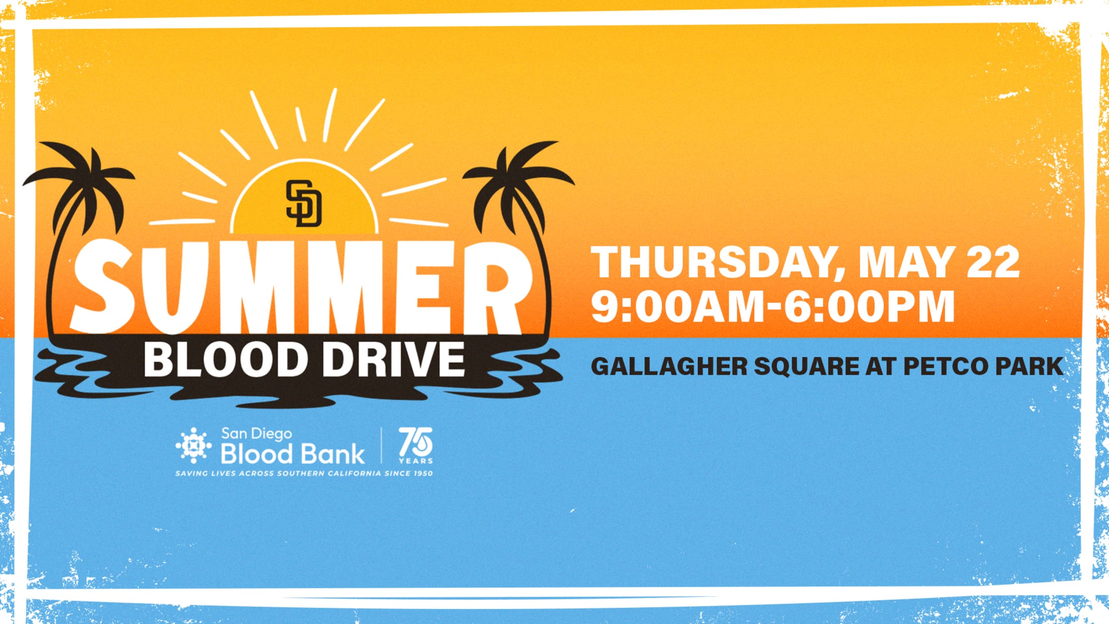 Join us for the Padres Summer Blood Drive in partnership with the San Diego Blood Bank! The event will be held on Thursday, May 22 from 9 AM to 6 PM in Gallagher Square at Petco Park. Donors will receive a commemorative Padres Summer Blood Drive t-shirt and two tickets to a Padres home game while supplies last.