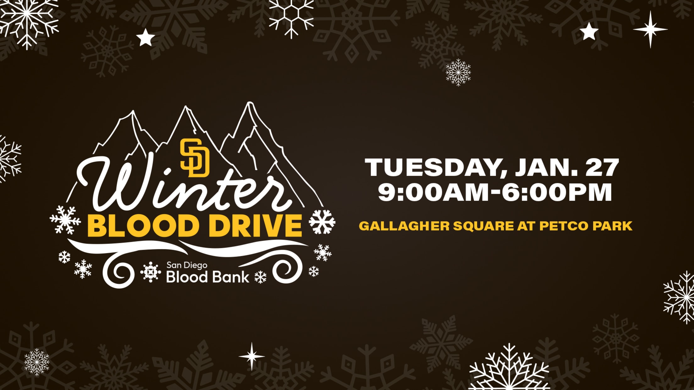 Join us for the Padres Winter Blood Drive in partnership with the San Diego Blood Bank! The event will be held on Tuesday, January 27 from 9 AM to 6 PM in Gallagher Square at Petco Park.