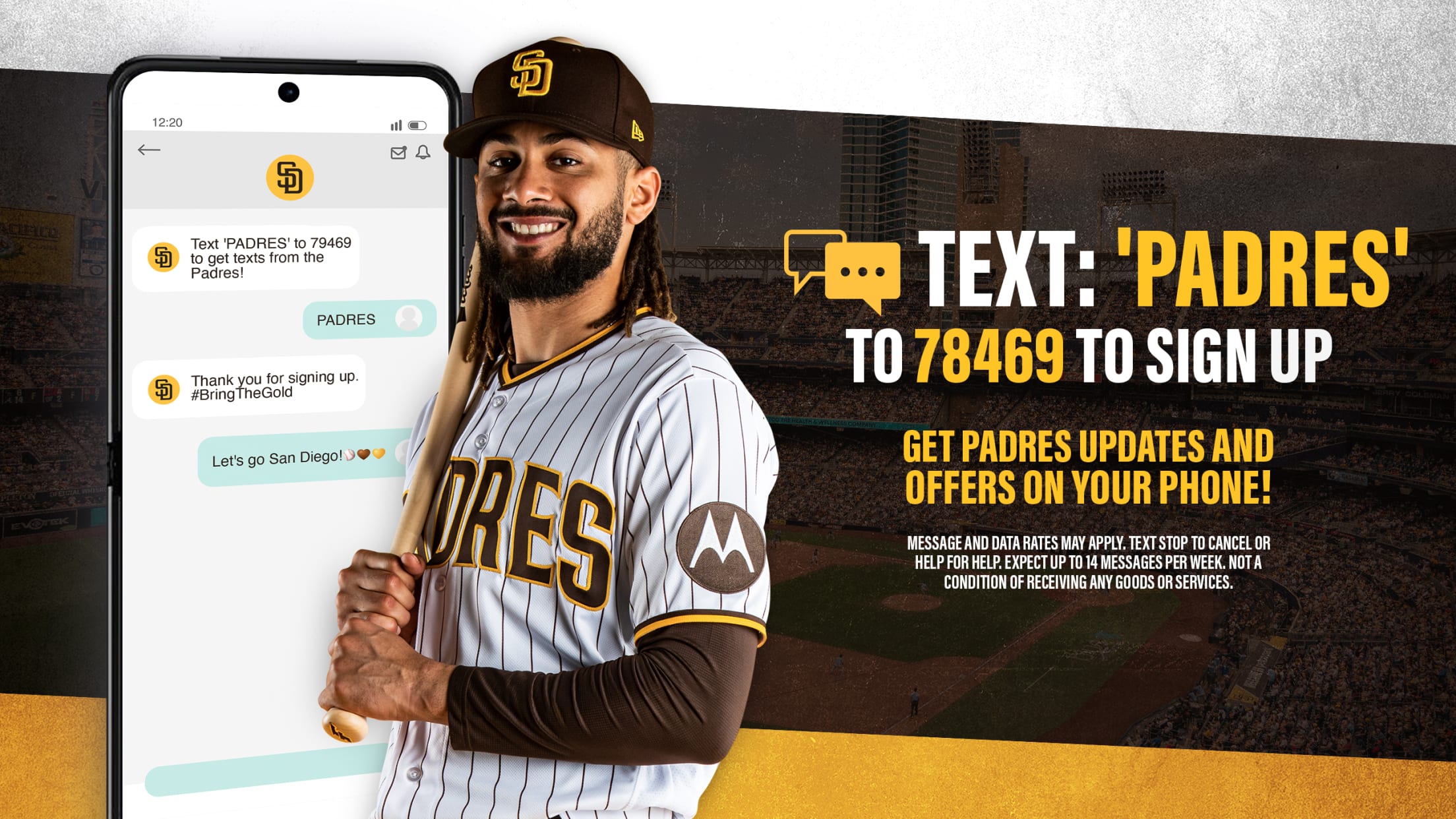 Sign up for Padres Text Messages! Receive exclusive Padres news, presales, content, and more! Text āPADRESā to 78469 to join the fun!