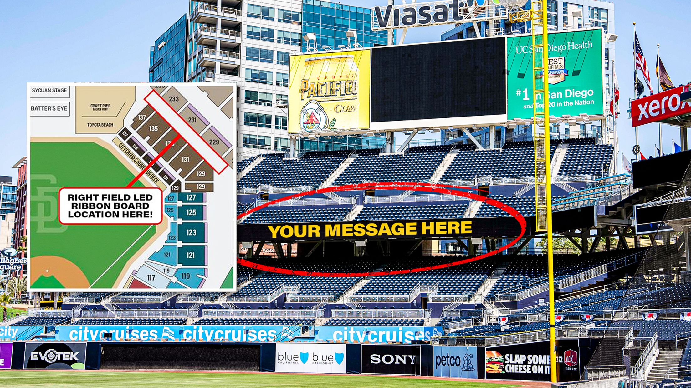 - To verify your seat location is in view of the right field LED ribbon board, please visit https://www.mlb.com/padres/ballpark/seat-map.