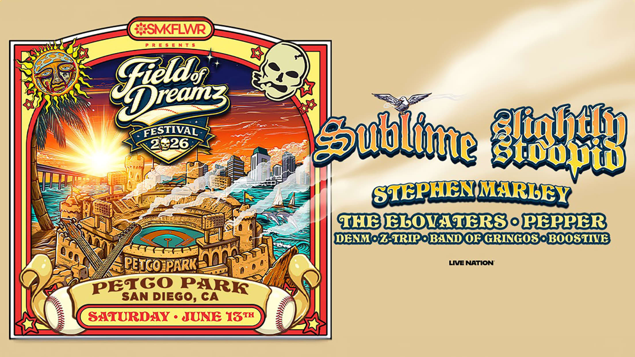 San Diego-based Slightly Stoopid just announced the Field of Dreamz Festival, set to take place at Petco Park on Saturday, June 13, 2026. This festival will span two stages and feature performances by Slightly Stoopid, Sublime, Stephen Marley, The Elovaters, Pepper, DENM, Z-Trip, Band of Gringos, and Boostive. This one-of-a-kind event is set to be unforgettable. Tickets will go on sale to the general public on Saturday, February 21 at 10 AM PT.