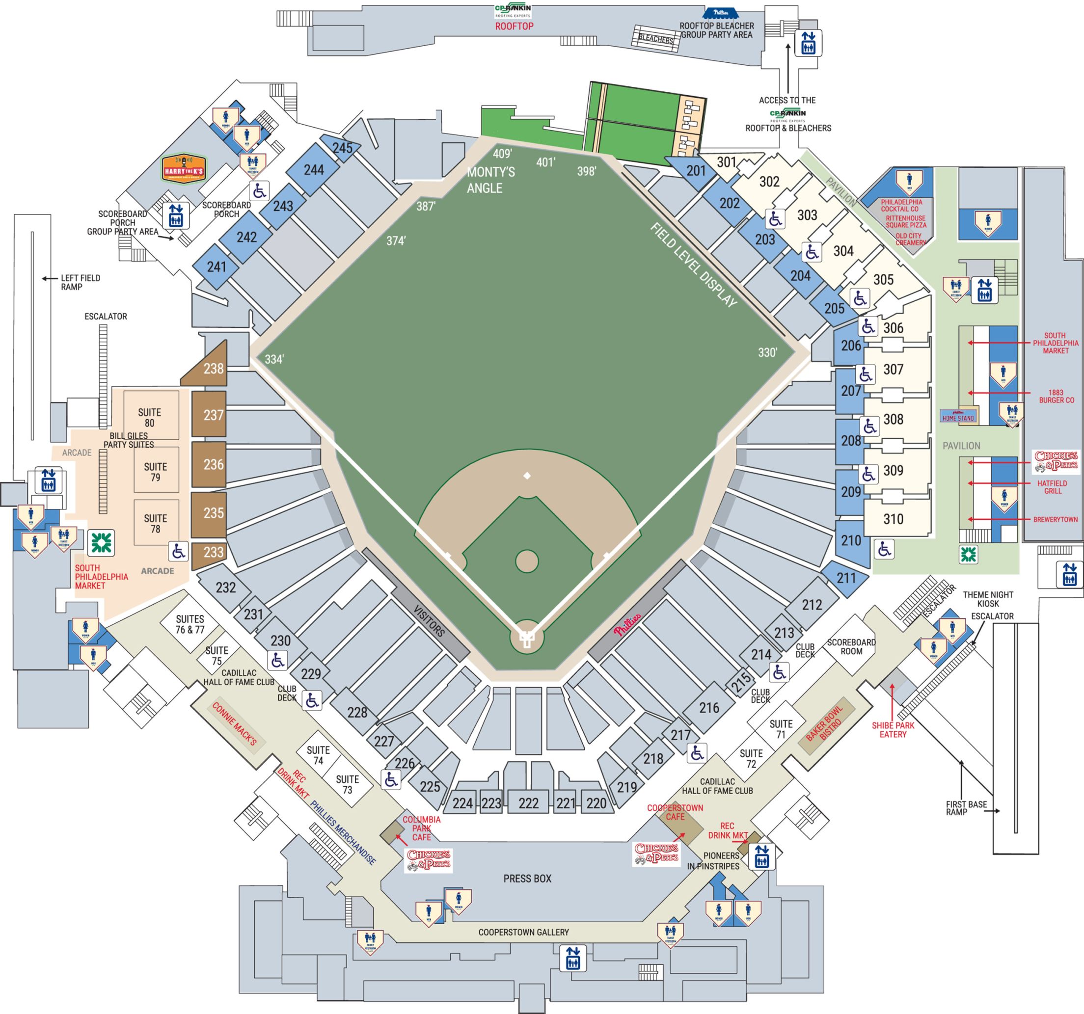 Shibe Park Eatery (behind Section 212) Featuring pizzas, Richman’s soft-serve ice cream and traditional ballpark fare (for Hall of Fame Club guests).