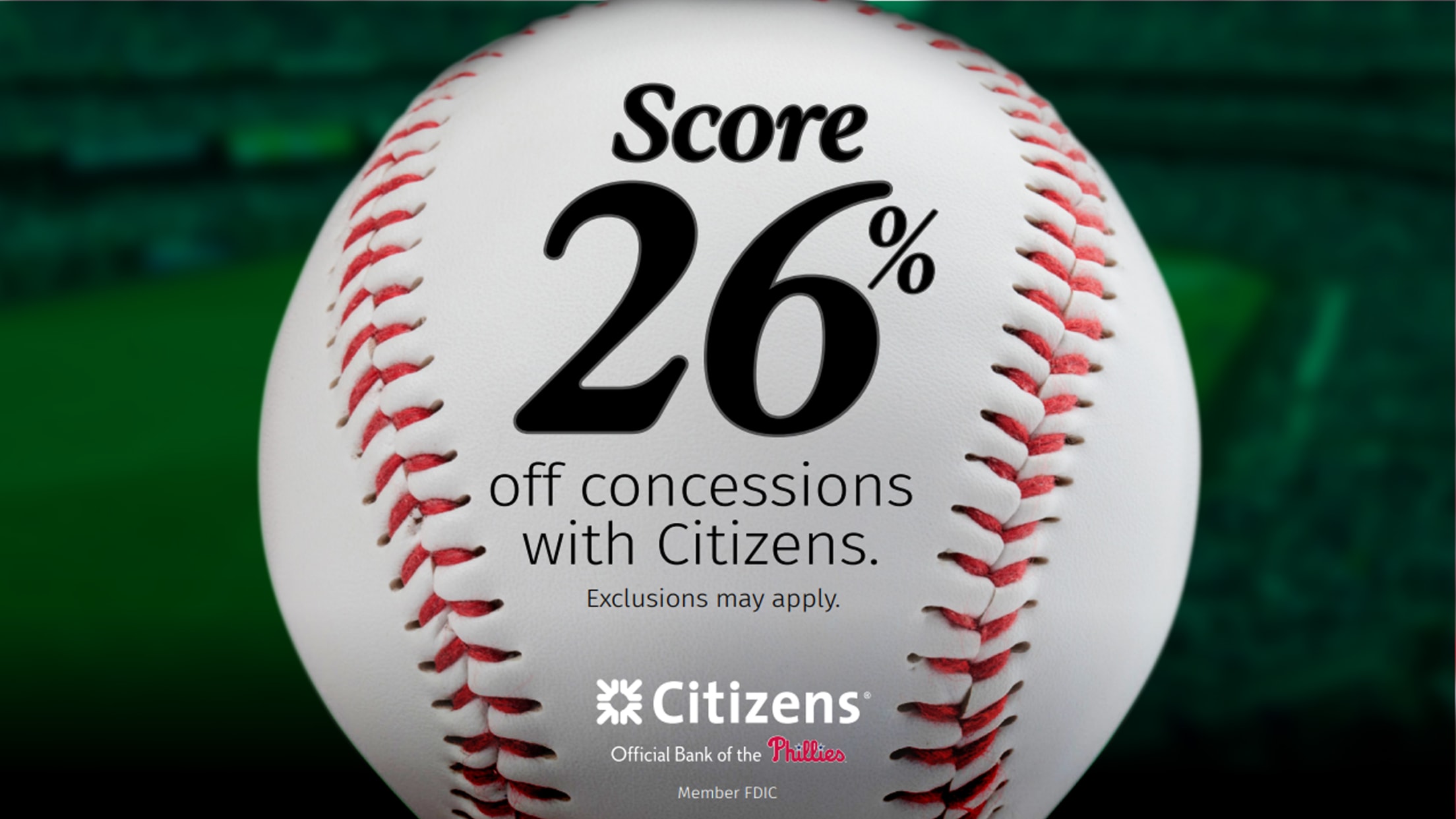 Celebrate a big year in Philadelphia. Save 26% with your Citizens debit and credit card at select home games - either upload your card to the Phillies wallet via the MLB Ballpark app or pay in person. Exclusions may apply.