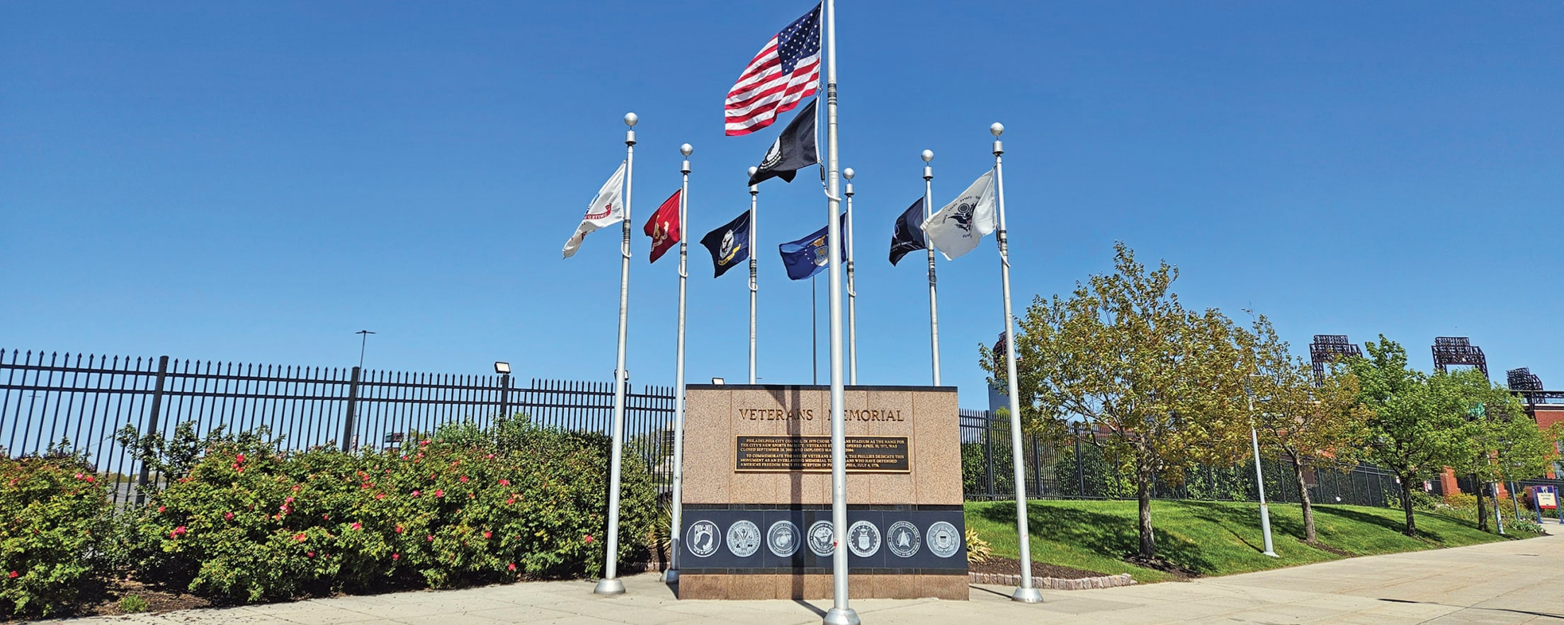 To commemorate the site of Veterans Stadium, the Phillies built a monument as an everlasting memorial to veterans. Located on Pattison Avenue, the monument includes engraved medallions and flags that fly year-round representing the Army, Marine Corps, Navy, Air Force, Space Force, Coast Guard and POW/MIA.