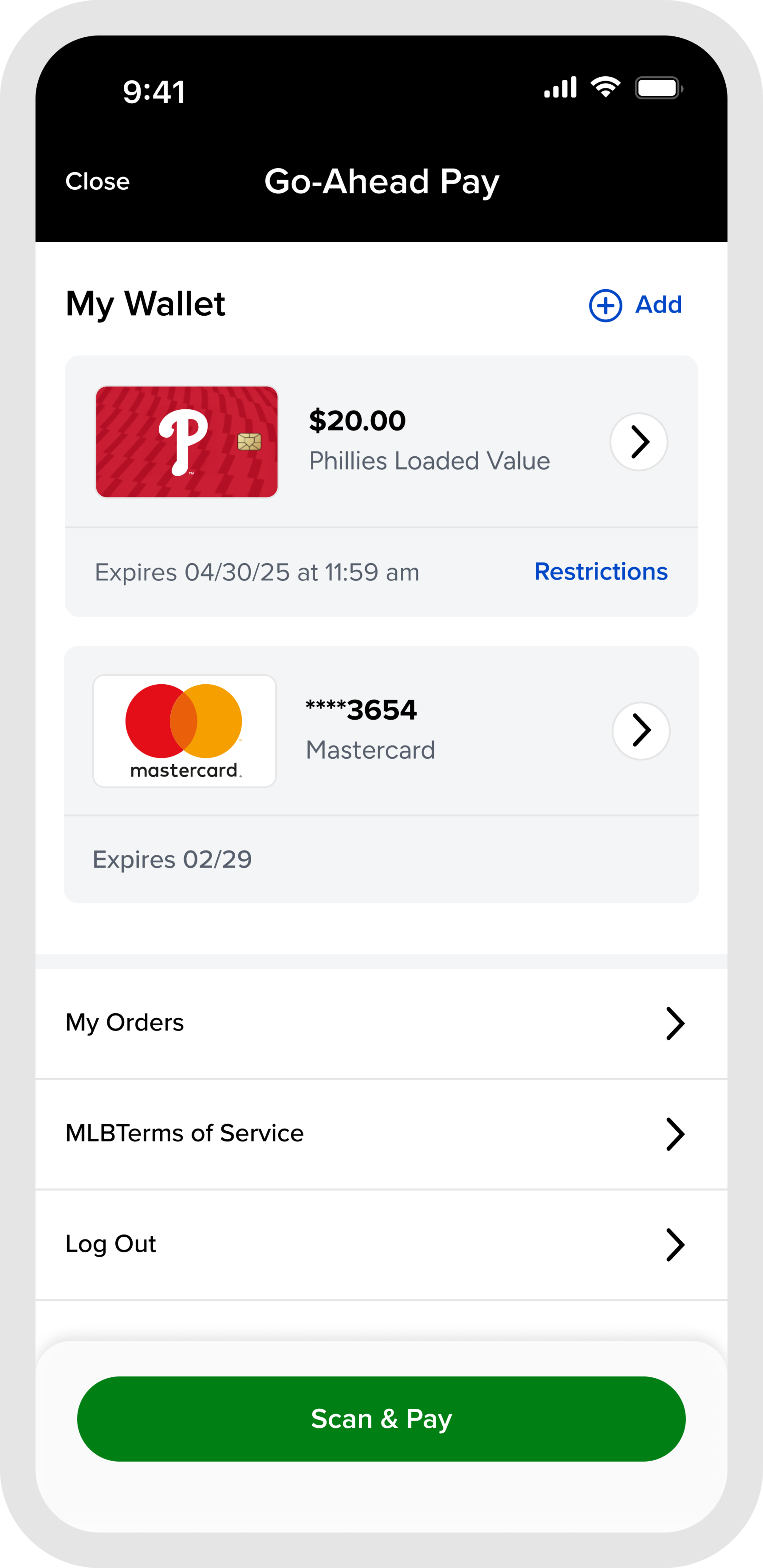 Select “Scan & Pay” to present or scan a unique QR code that includes your payment card and any applicable loaded value or discounts for concession and merchandise purchases at the ballpark