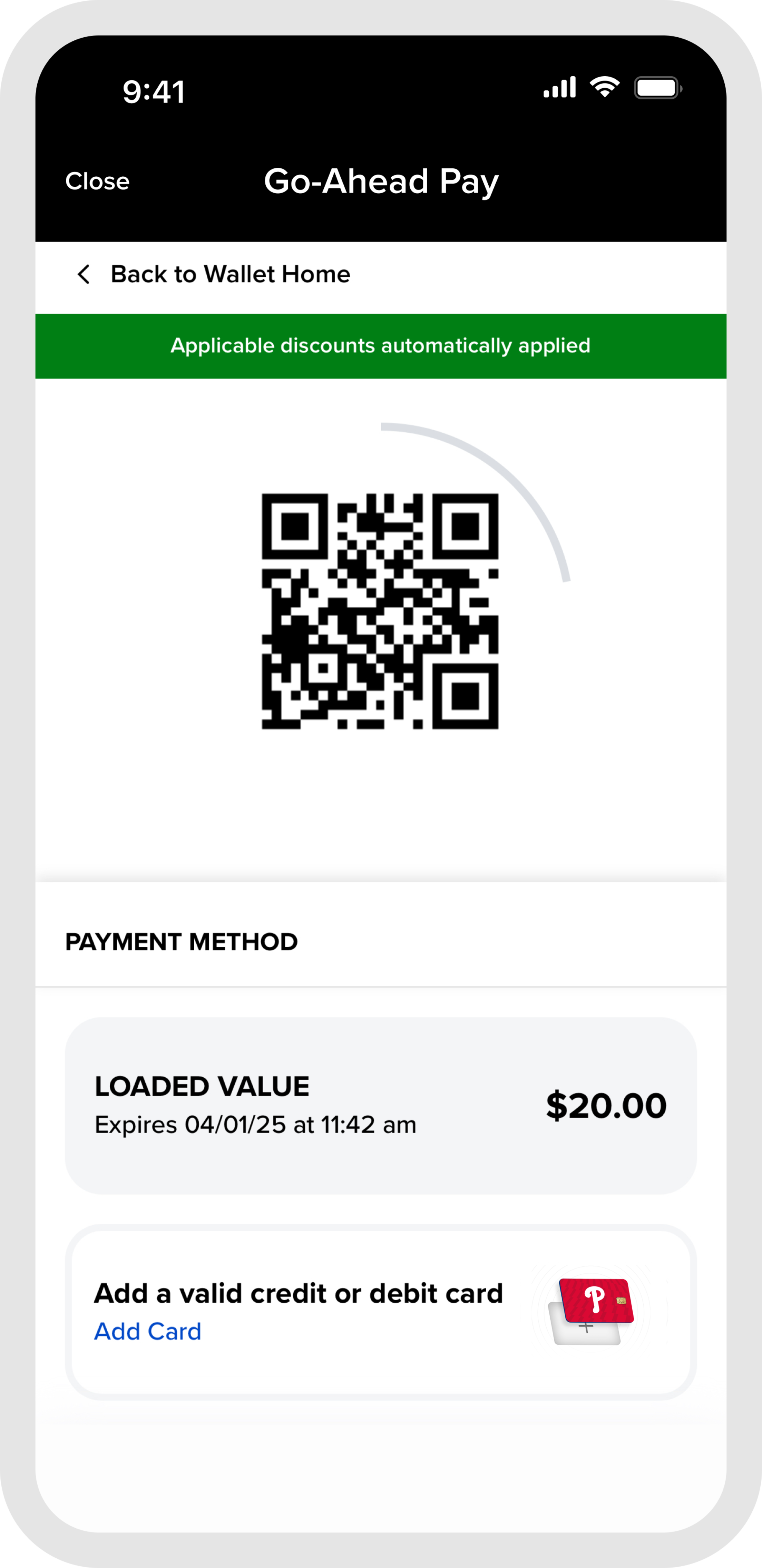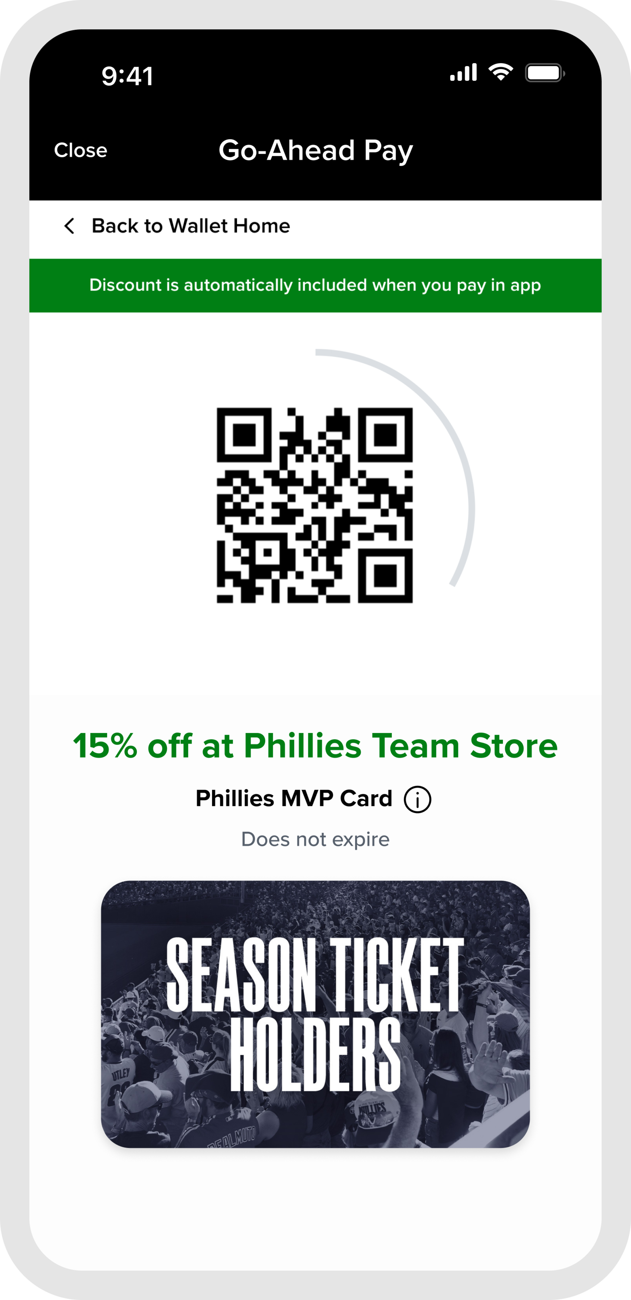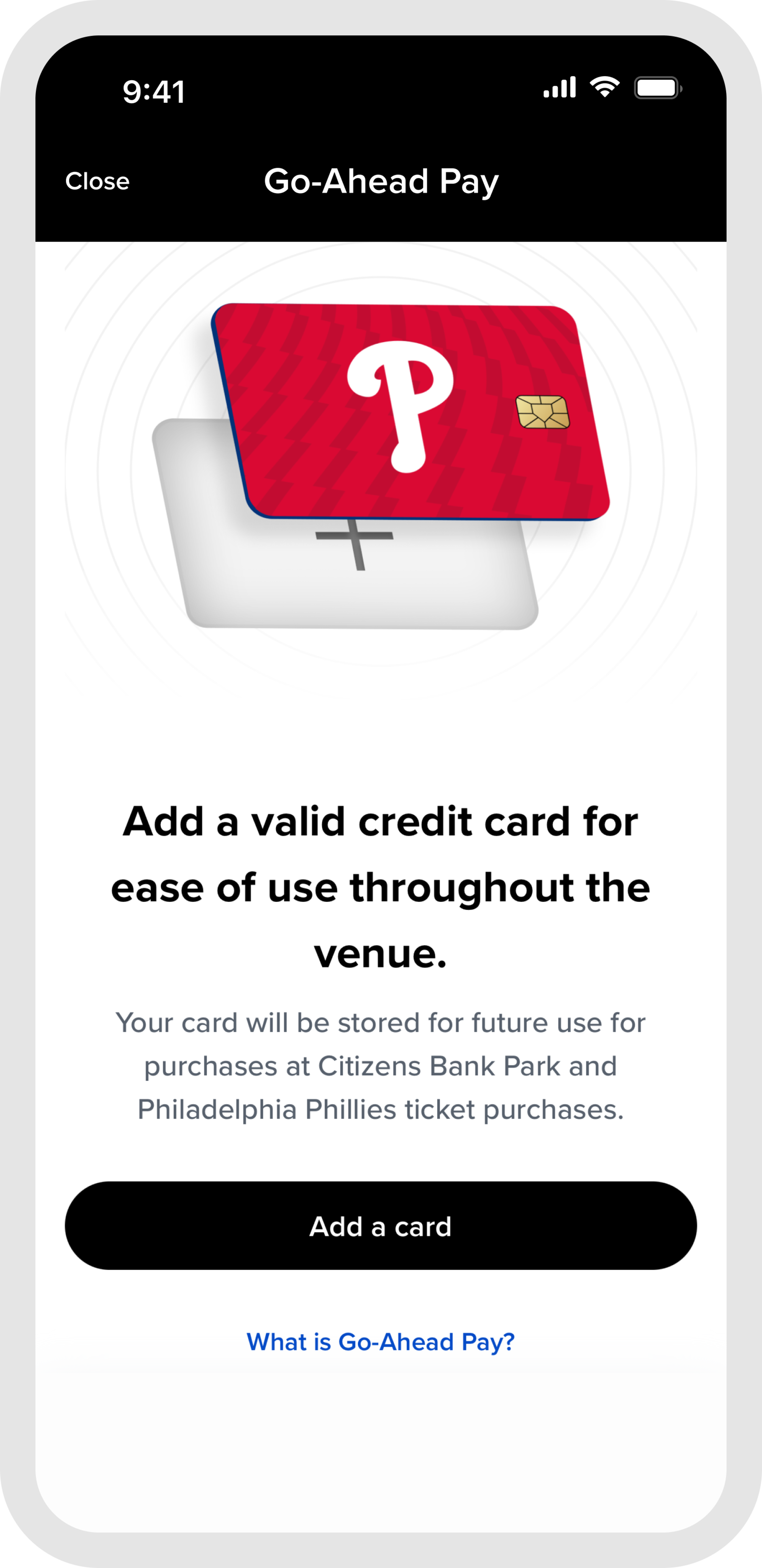 Go-Ahead Pay provides a seamless way for fans to manage their ticket entitlements and concession credit in one centralized wallet experience. Go-Ahead Pay is available to fans using the MLB Ballpark app at Citizens Bank Park concession and retail locations, some restrictions may apply based on the credit or discount. Please see Terms of Use and Privacy Policy for more information.