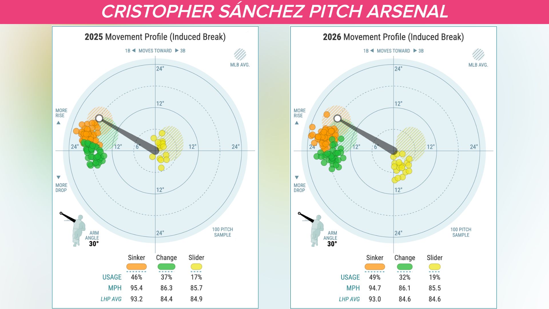 Now you add the revamped slider with more depth to those two elite-elite offerings, and Sánchez has all the weapons he needs to be a Cy Young pitcher. He can pound that sinker inside to lefties, with its combination of mid-to-upper 90s velocity and sharp movement -- that's how he dominated Shohei Ohtani in the postseason -- and then drop in a slider or sneak in a left-on-left changeup. And he can mix the sinker and changeup to righties, which both break more than the full width of the plate horizontally, but have nine mph of velo differential and a full foot of vertical movement differential.