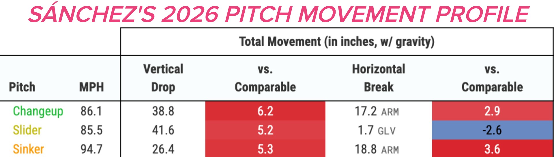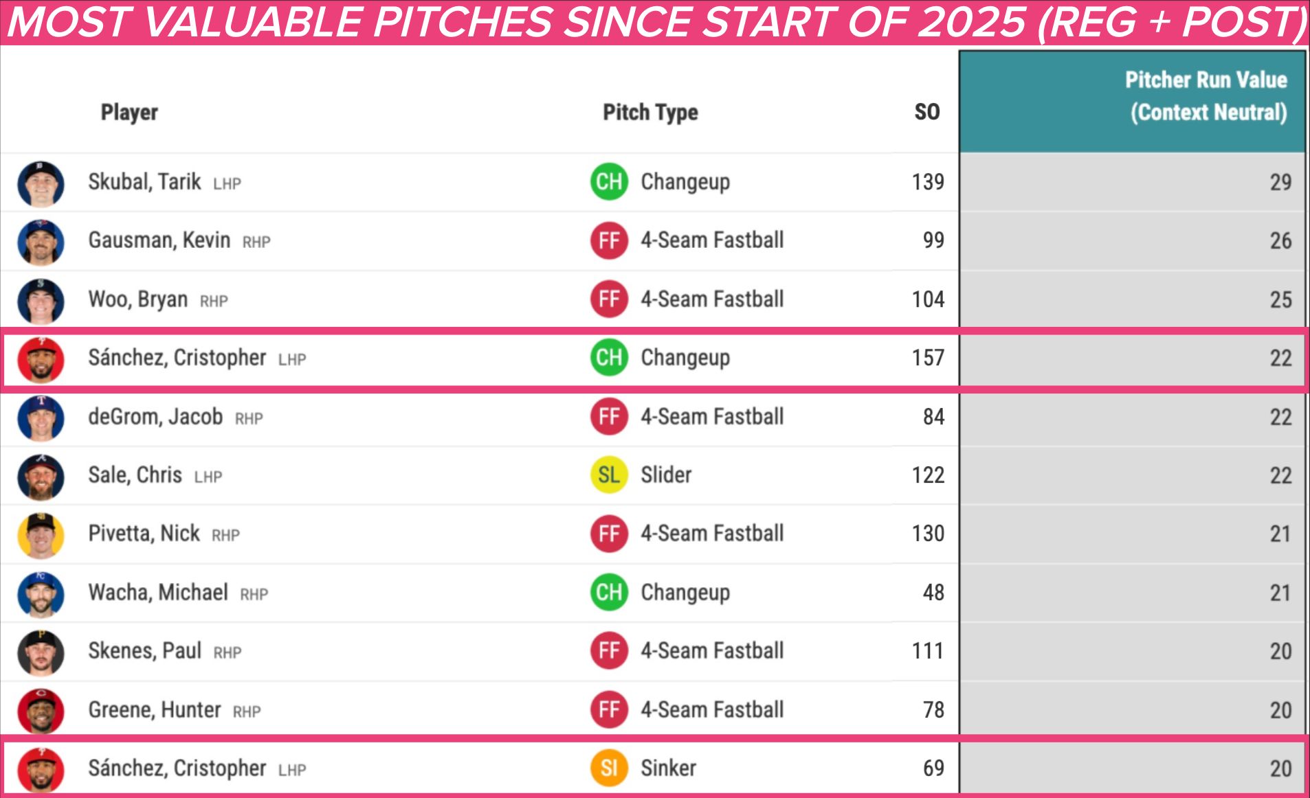 As MLB.com's Paul Casella noted in a nice breakdown of Sánchez's rise to Cy Young level heading into 2026, Sánchez's sinker-changeup combo is MLB's most valuable two-pitch combo. Both his sinker and changeup are top-10 pitches overall since the start of last season, and Sánchez is the only guy with multiple pitches on that list.