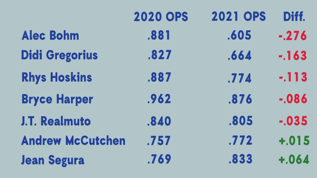 Even when healthy, many of those players haven't produced the way they did last year. Of the seven regular starters who were also with the club last year, five have seen their OPS drop by at least 50 points -- and three have experienced a 100-point dip.