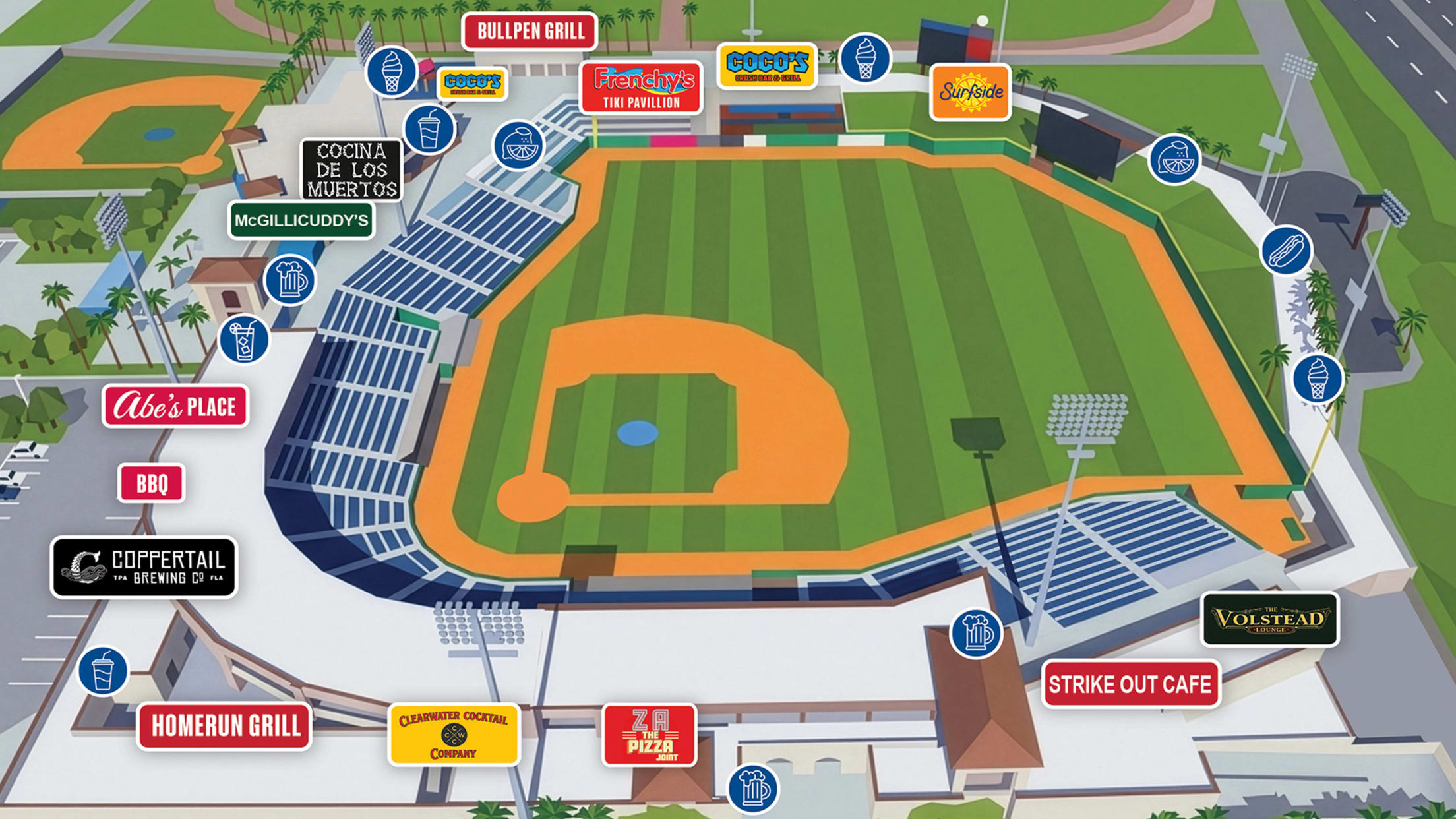 Located on the first base concourse, Clearwater Cocktail Company is a full-service bar offering a selection of premium handcrafted cocktails. Be sure to try the Clearwater Cooler, a brand-new frozen specialty created for game day.