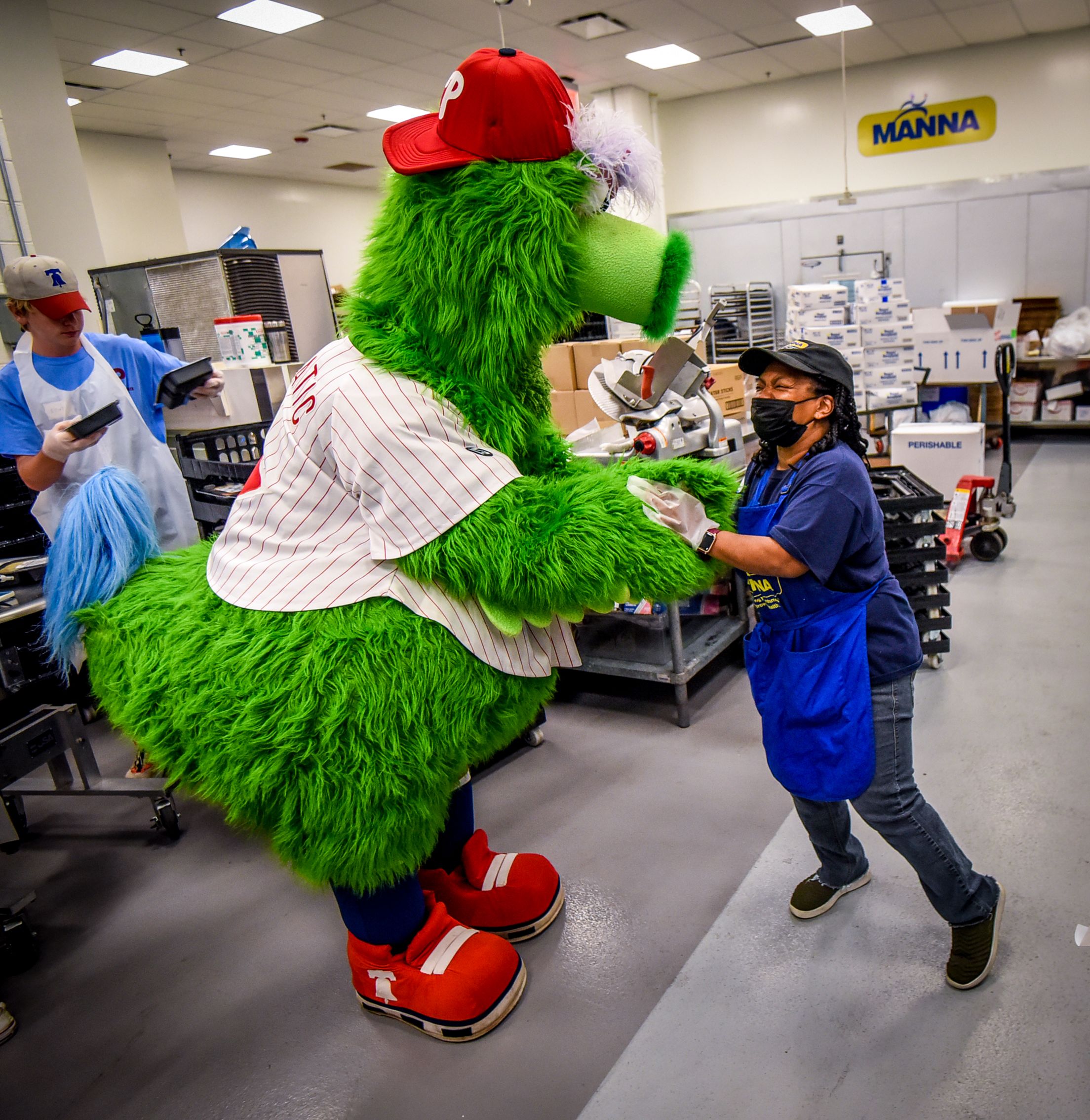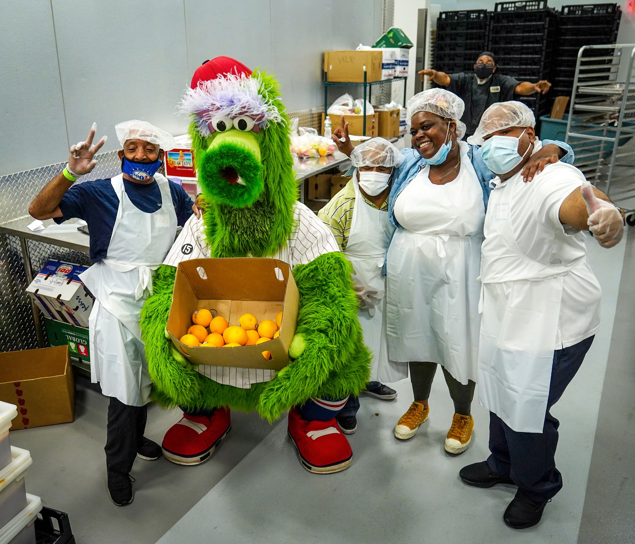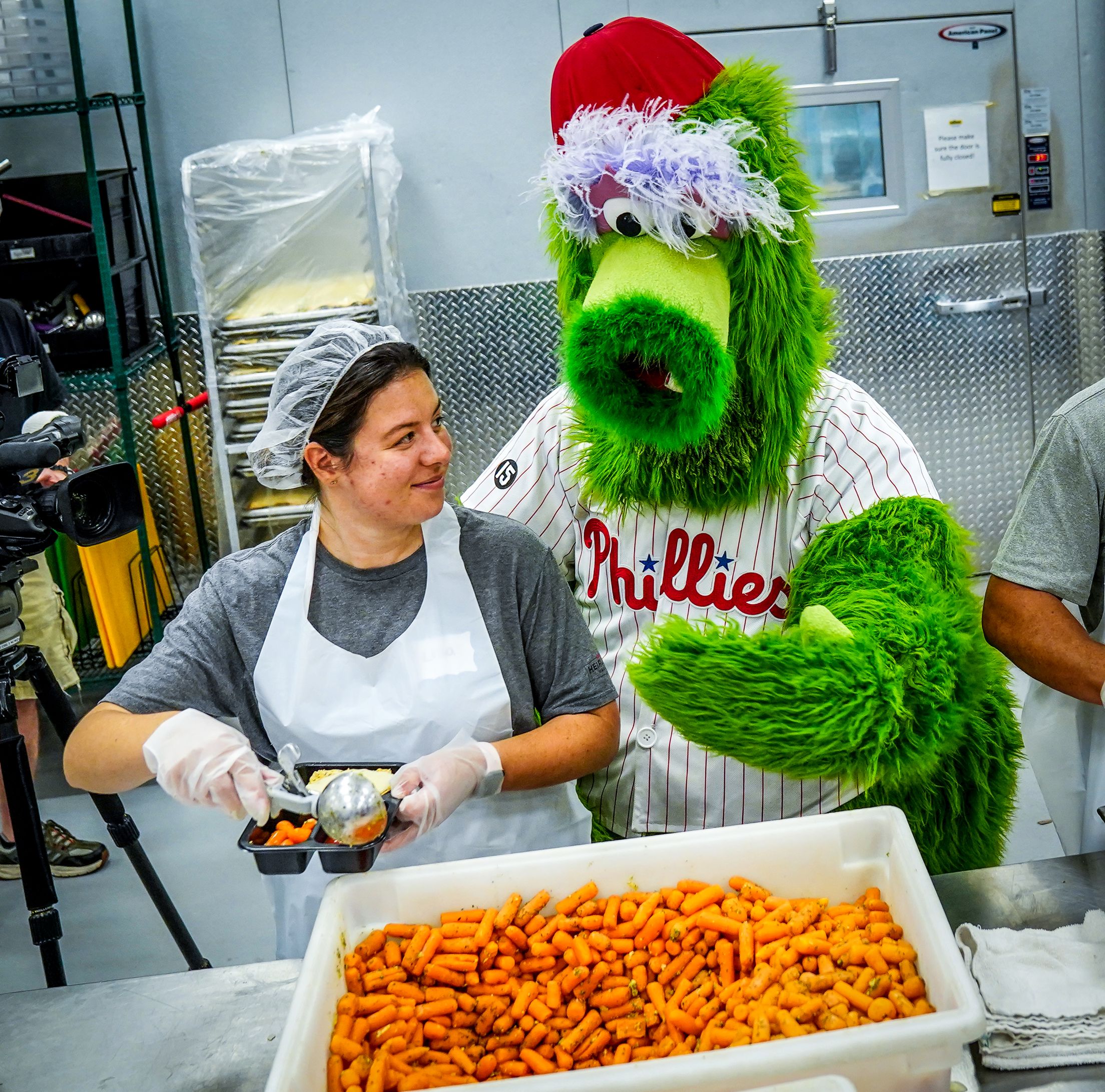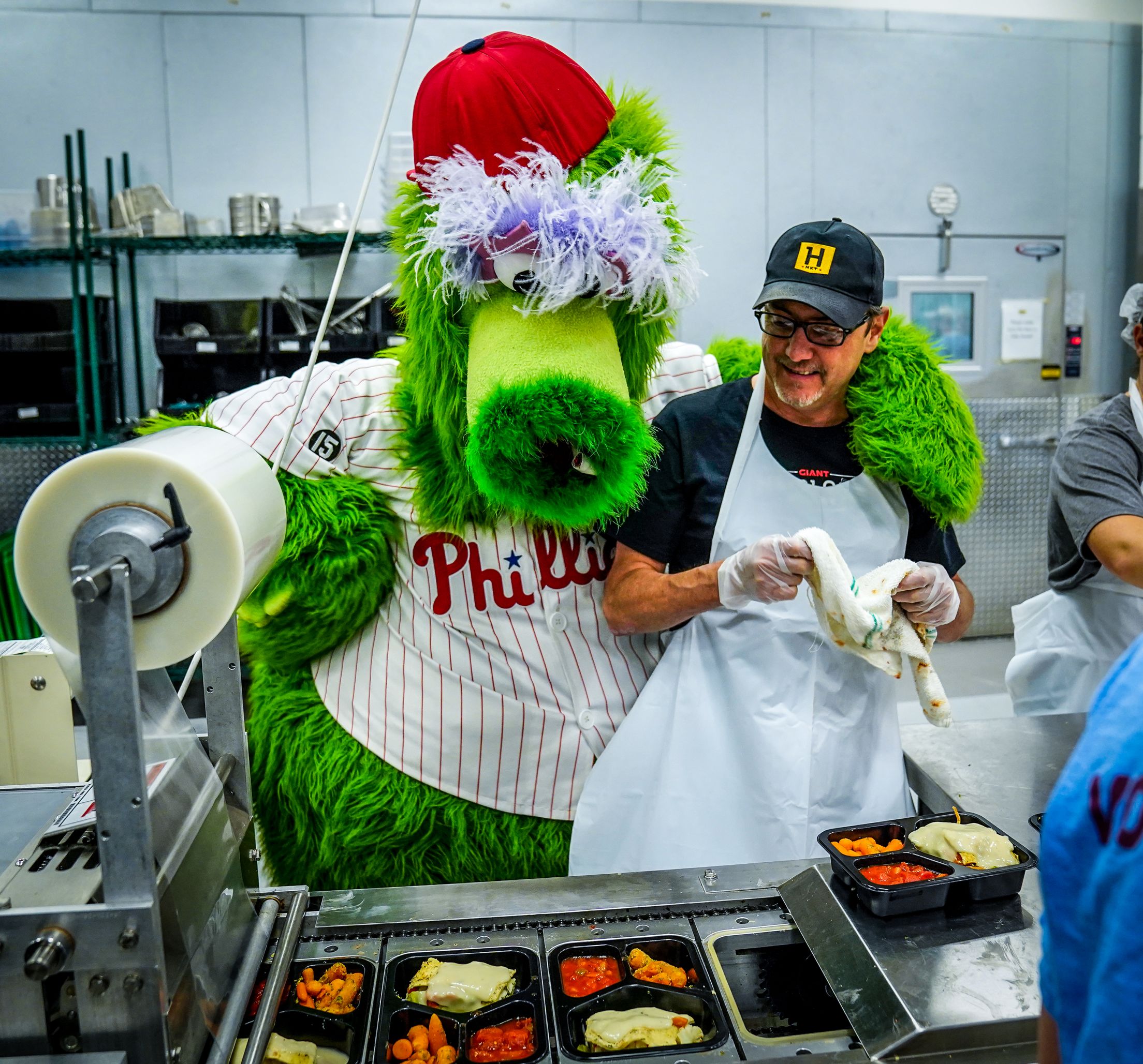 Members of the Phillies Phamily (including the Phillie Phanatic!) stepped out of Citizens Bank Park and into MANNA’s kitchen, where they helped chop, dice, cook, bake and package meals to be delivered to area neighbors who are battling life-threatening illnesses.