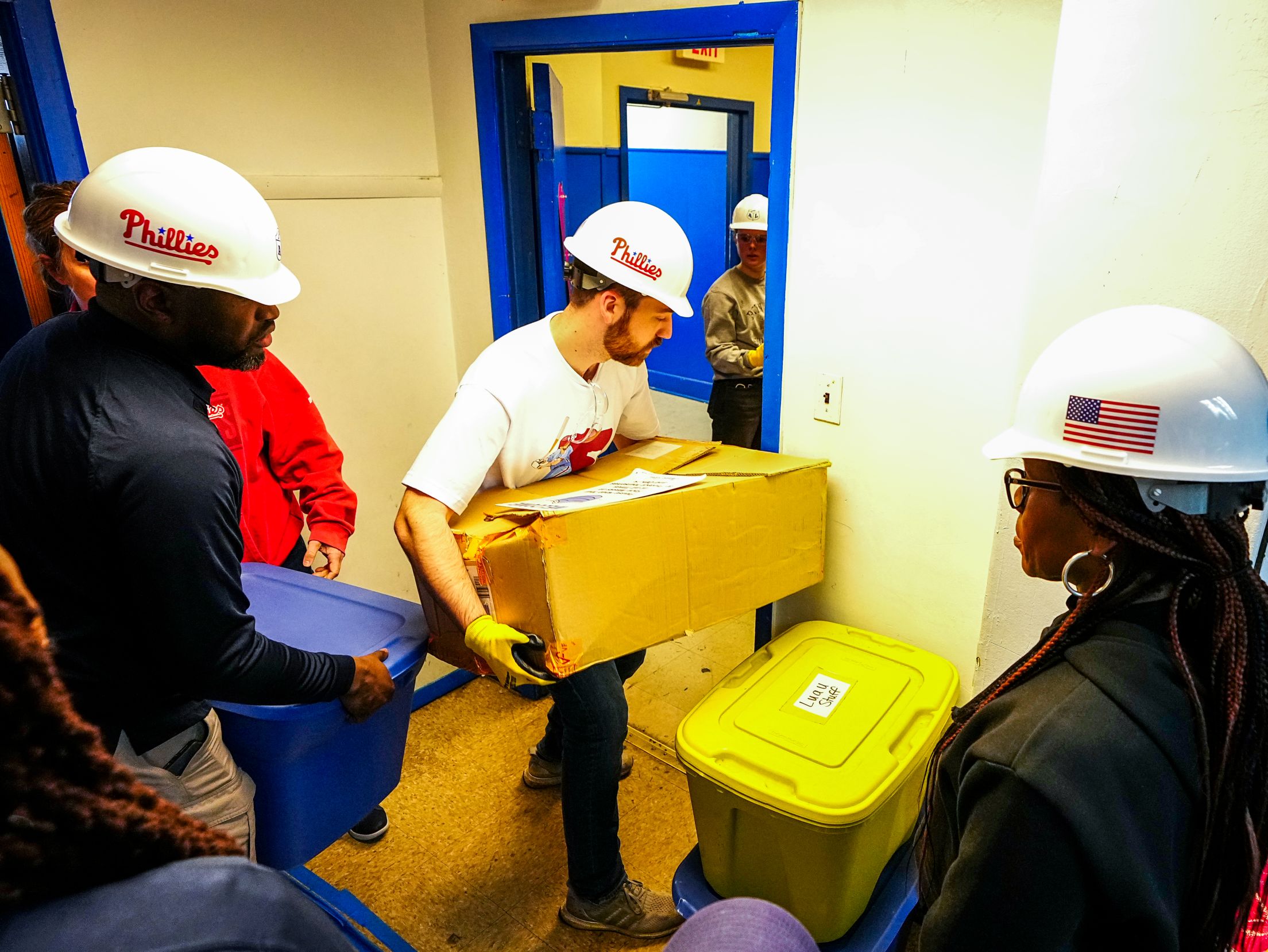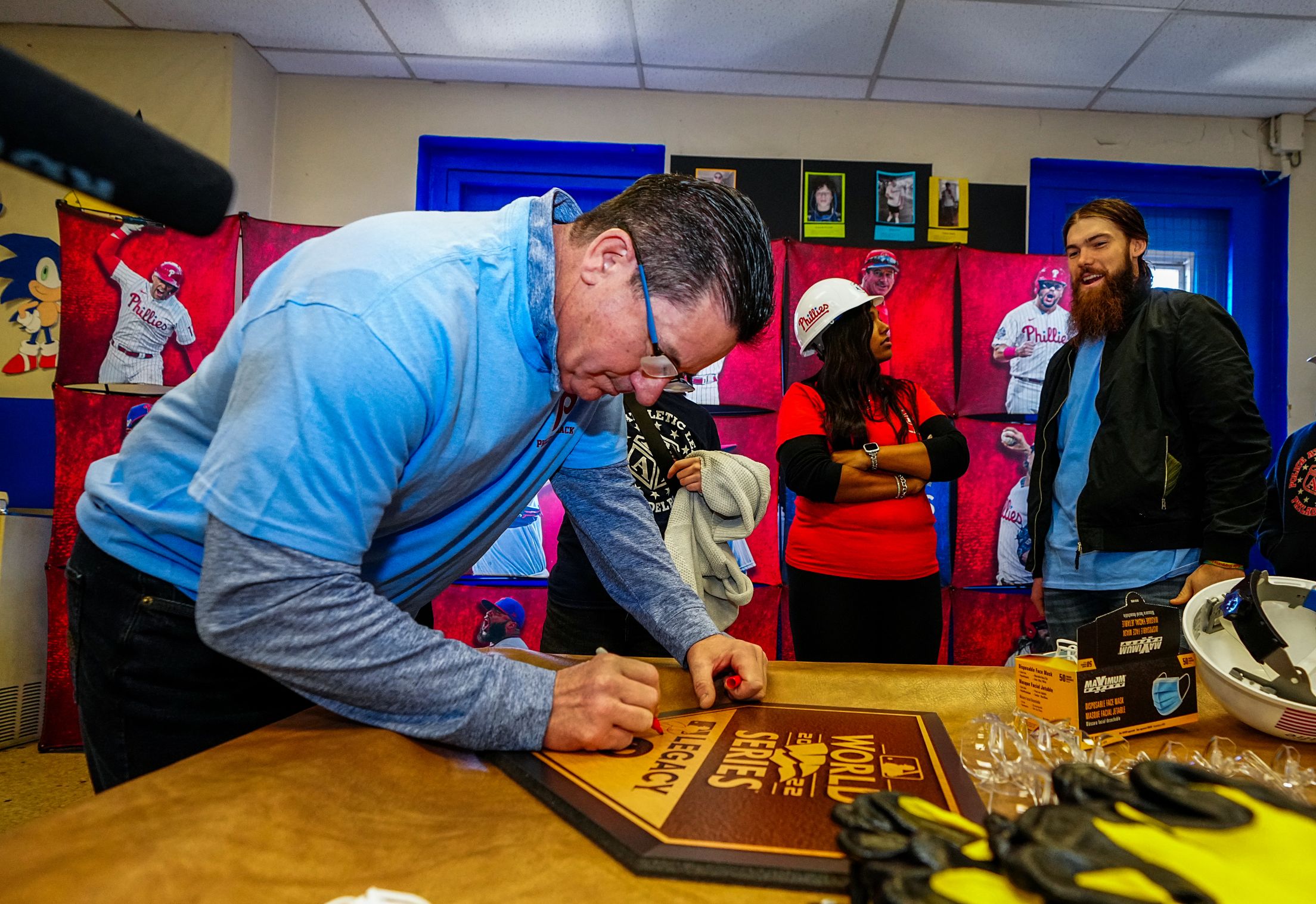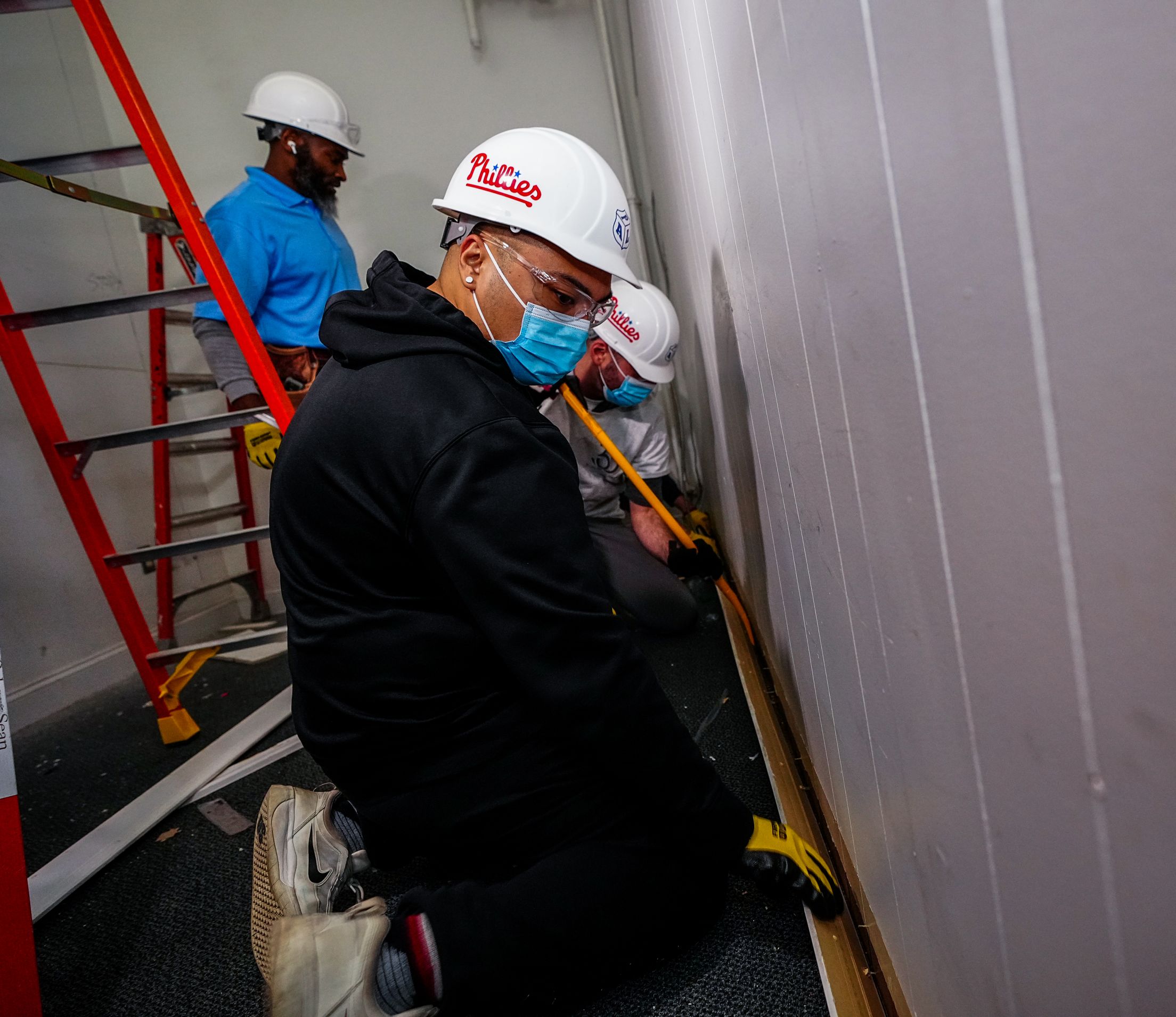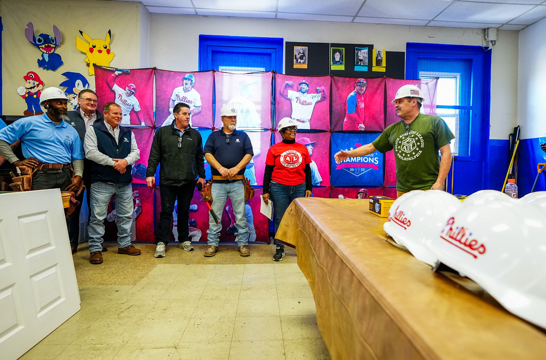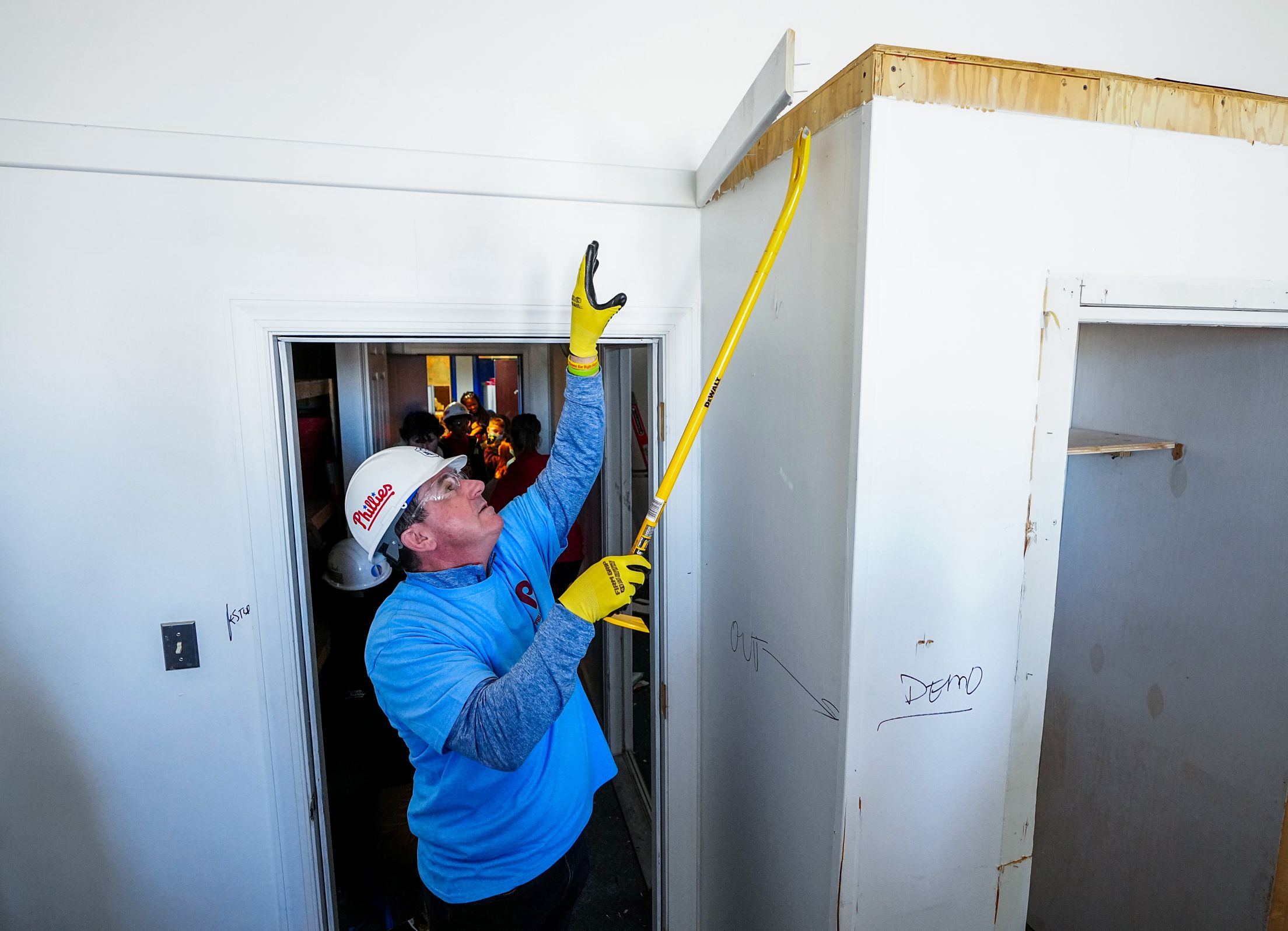 Phillies manager Rob Thomson and outfielderBrandon Marsh, along with volunteers from the Phillies front office, made a special visit to the 24th PAL Center as they joined PAL officers and kids to assist with the removal of walls, floor tile and light debris, as they help to make way for a new e-gaming room to be built this winter, created through the MLB Fall Classic Legacy Initiative.