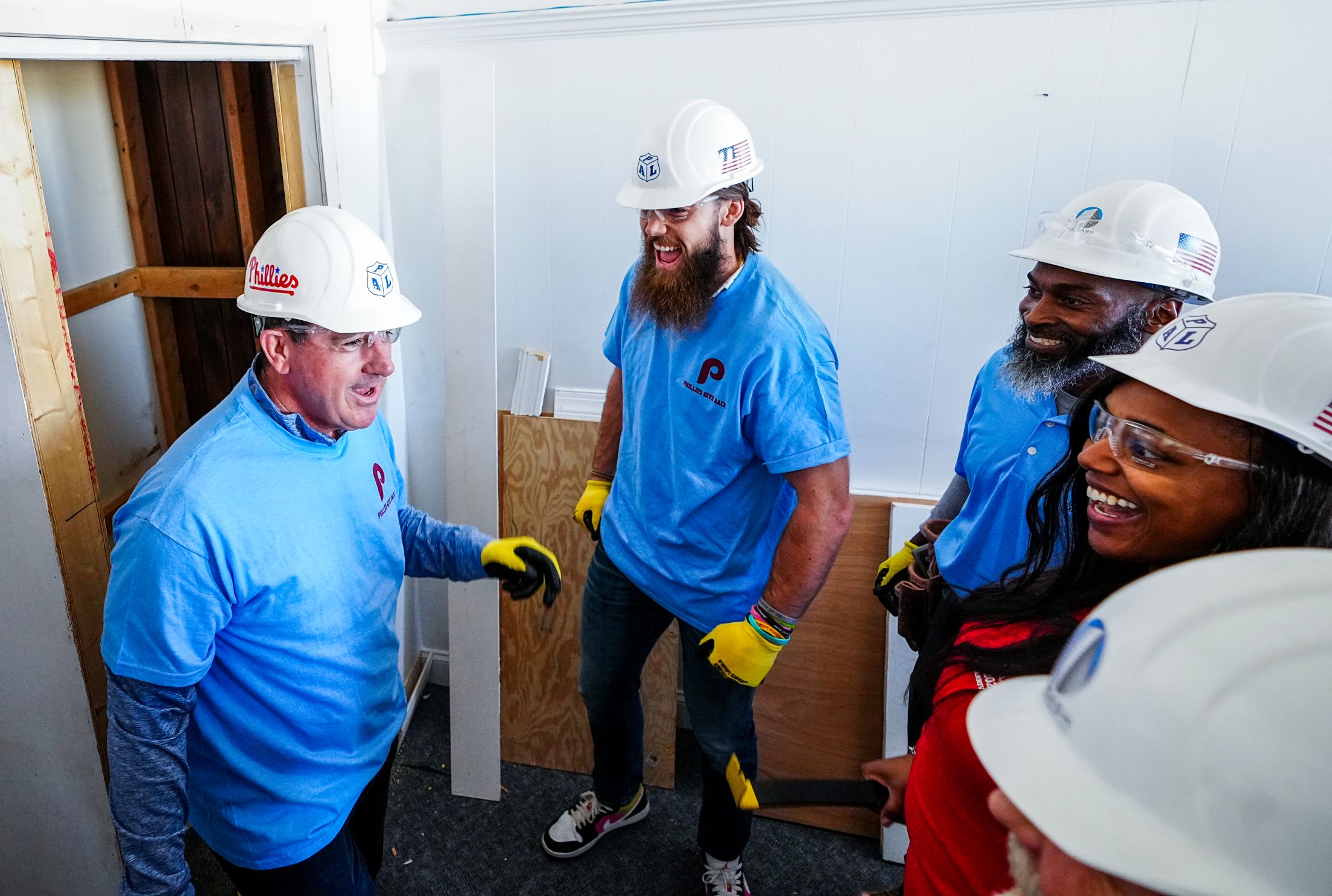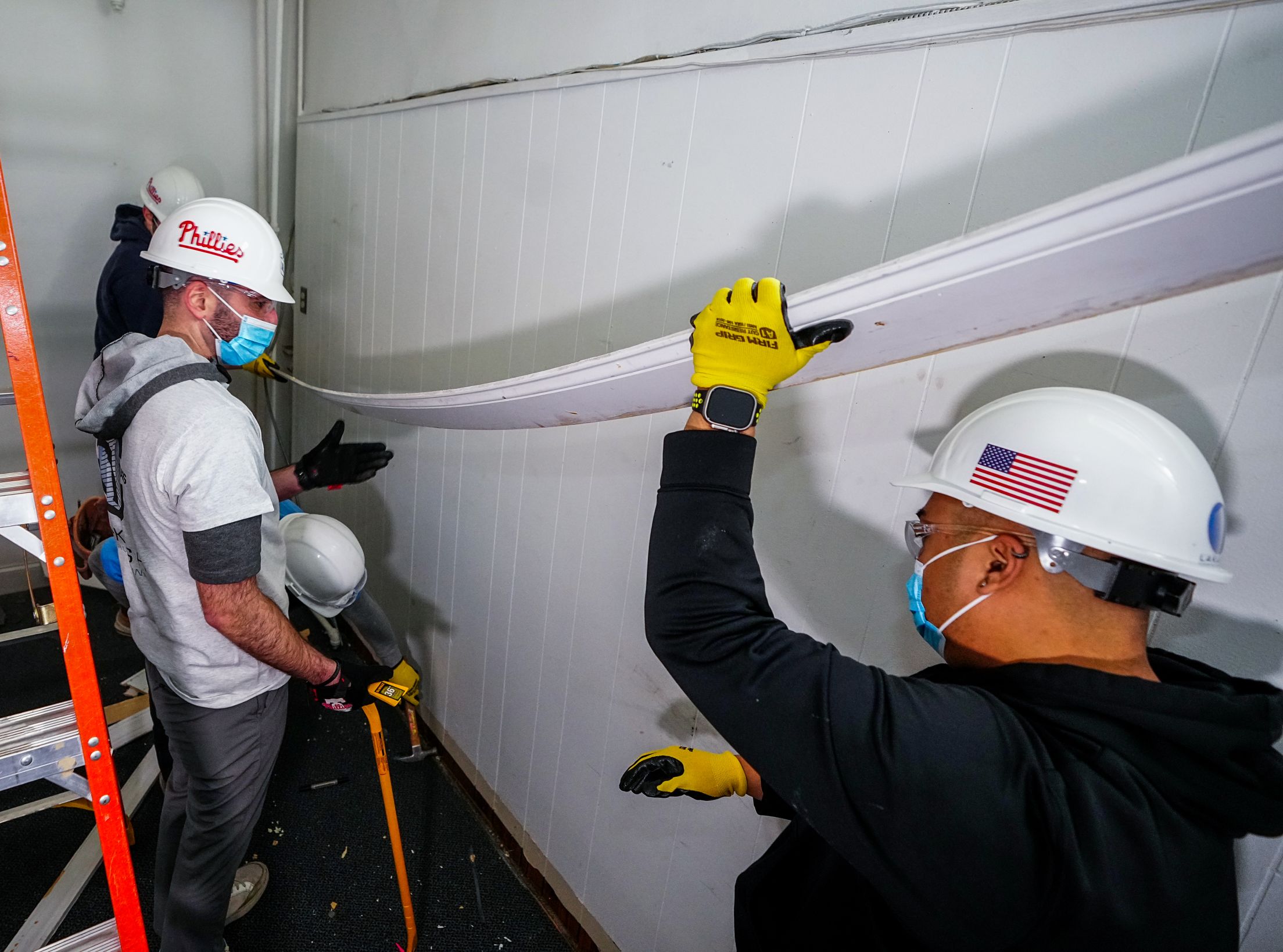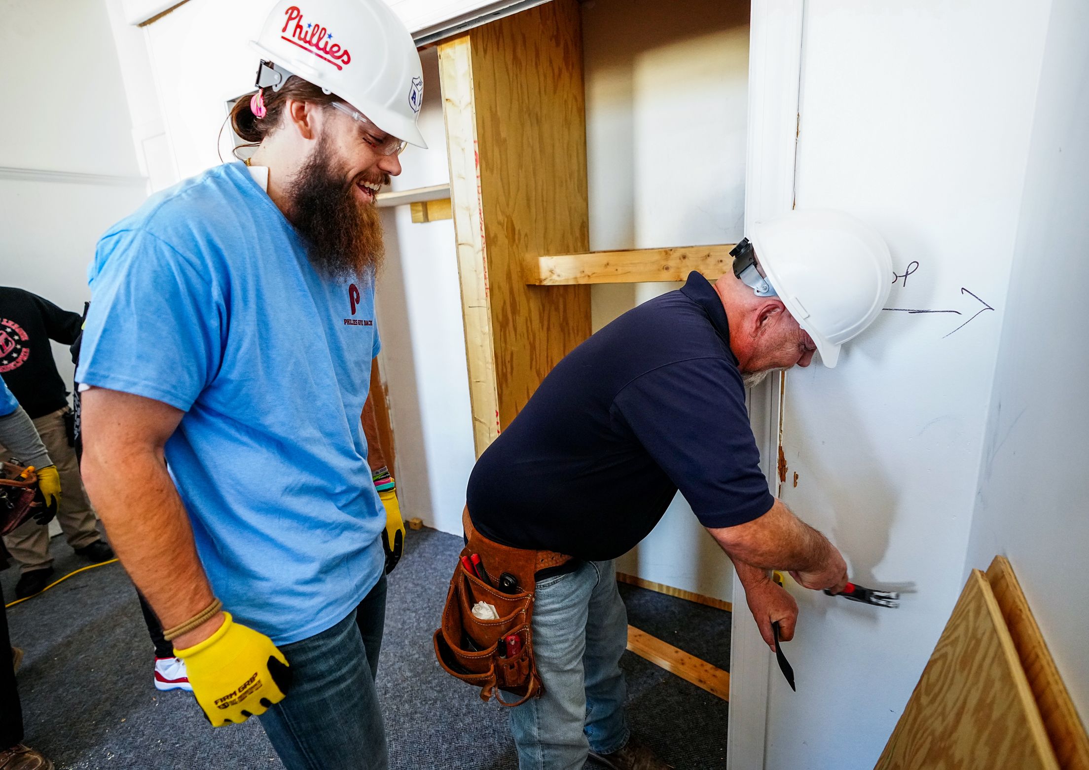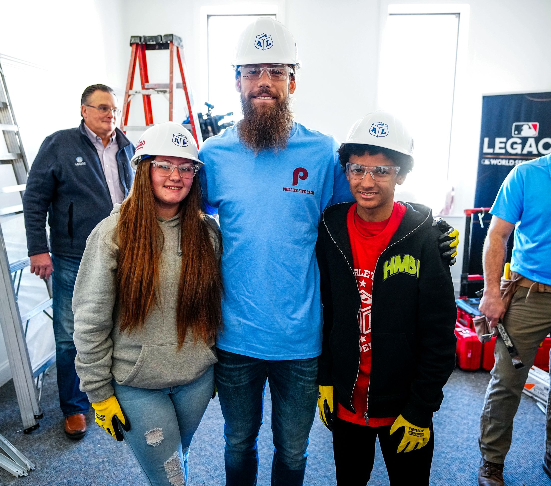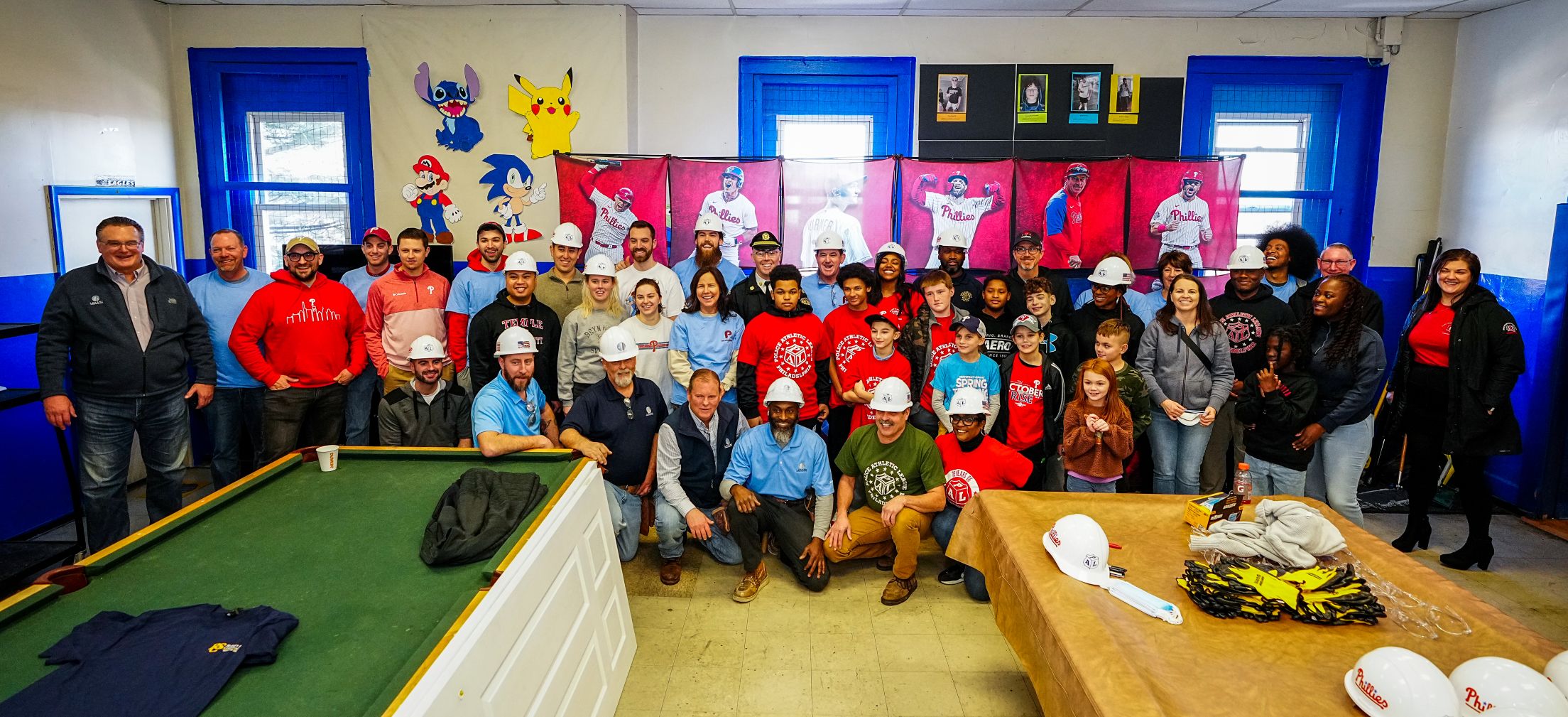 Phillies manager Rob Thomson and outfielderBrandon Marsh, along with volunteers from the Phillies front office, made a special visit to the 24th PAL Center as they joined PAL officers and kids to assist with the removal of walls, floor tile and light debris, as they help to make way for a new e-gaming room to be built this winter, created through the MLB Fall Classic Legacy Initiative.