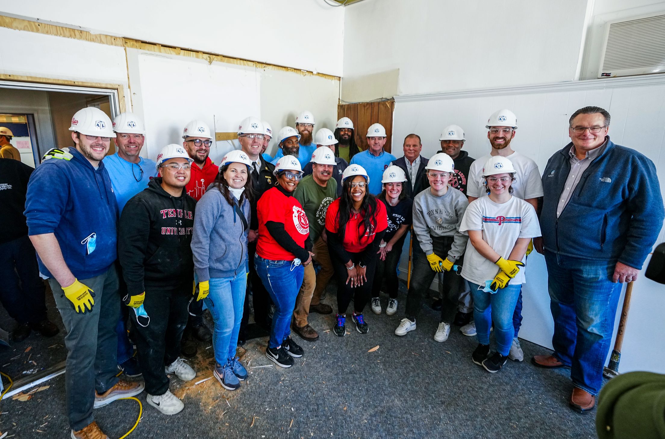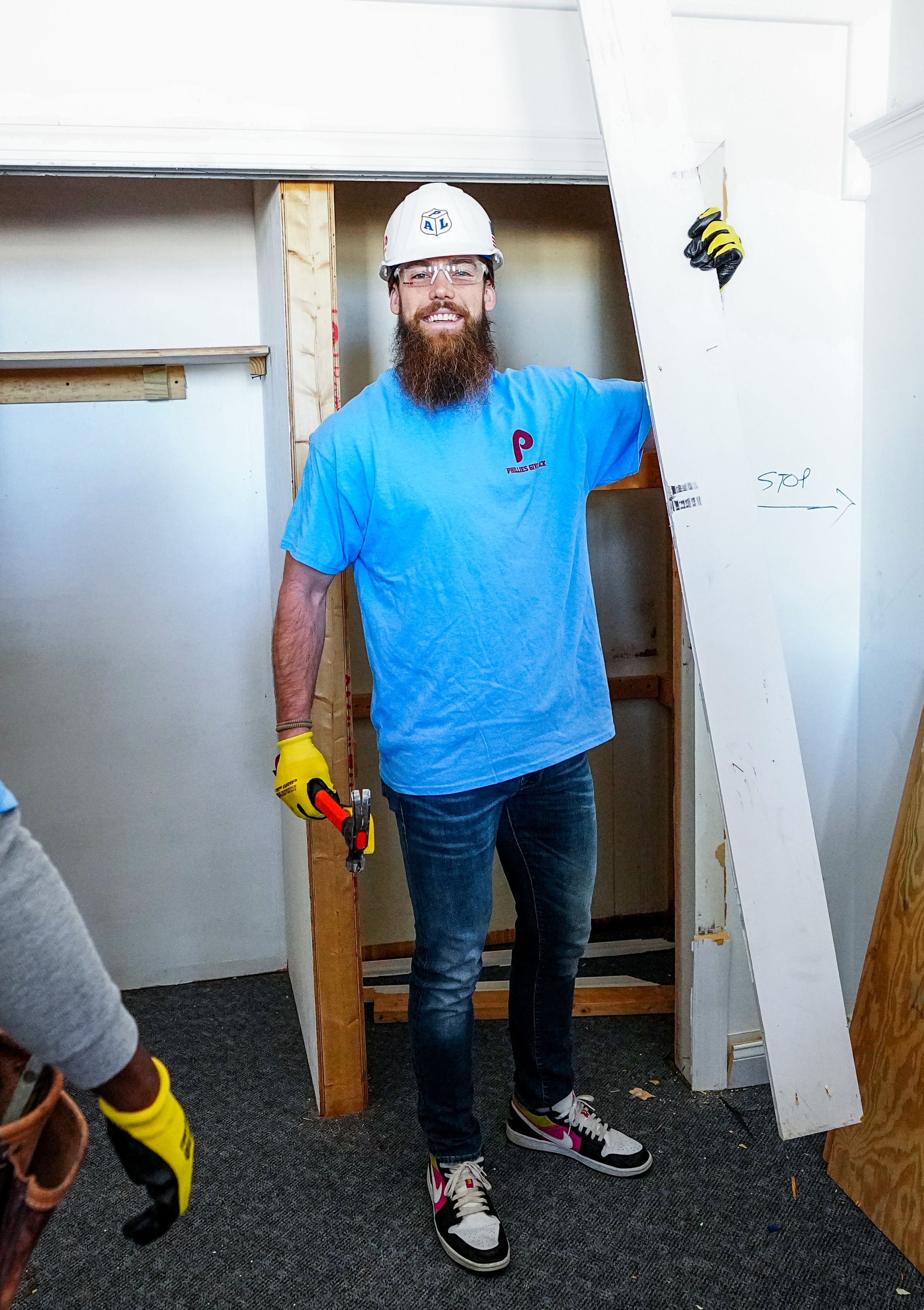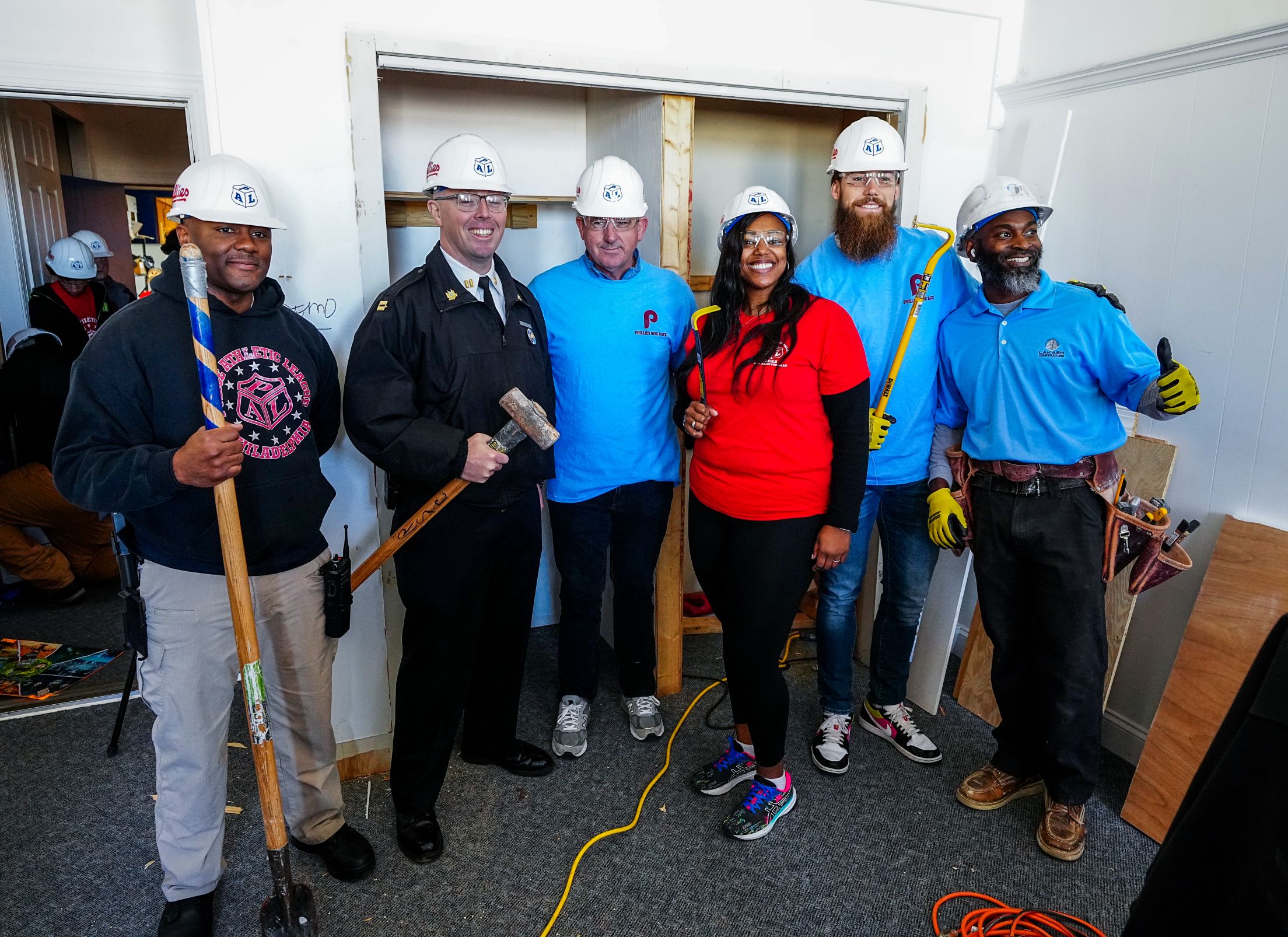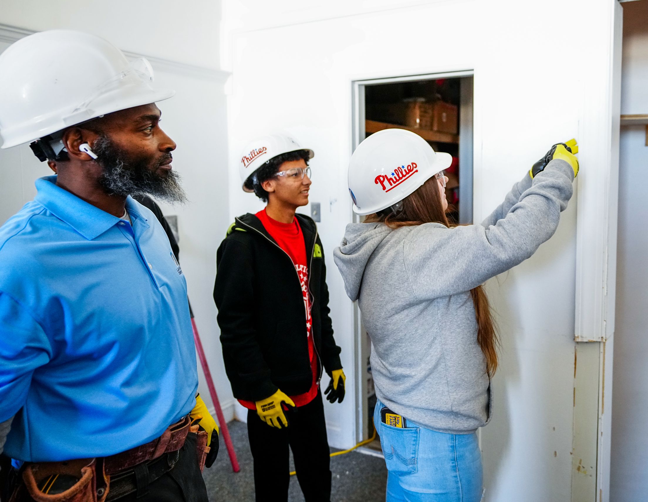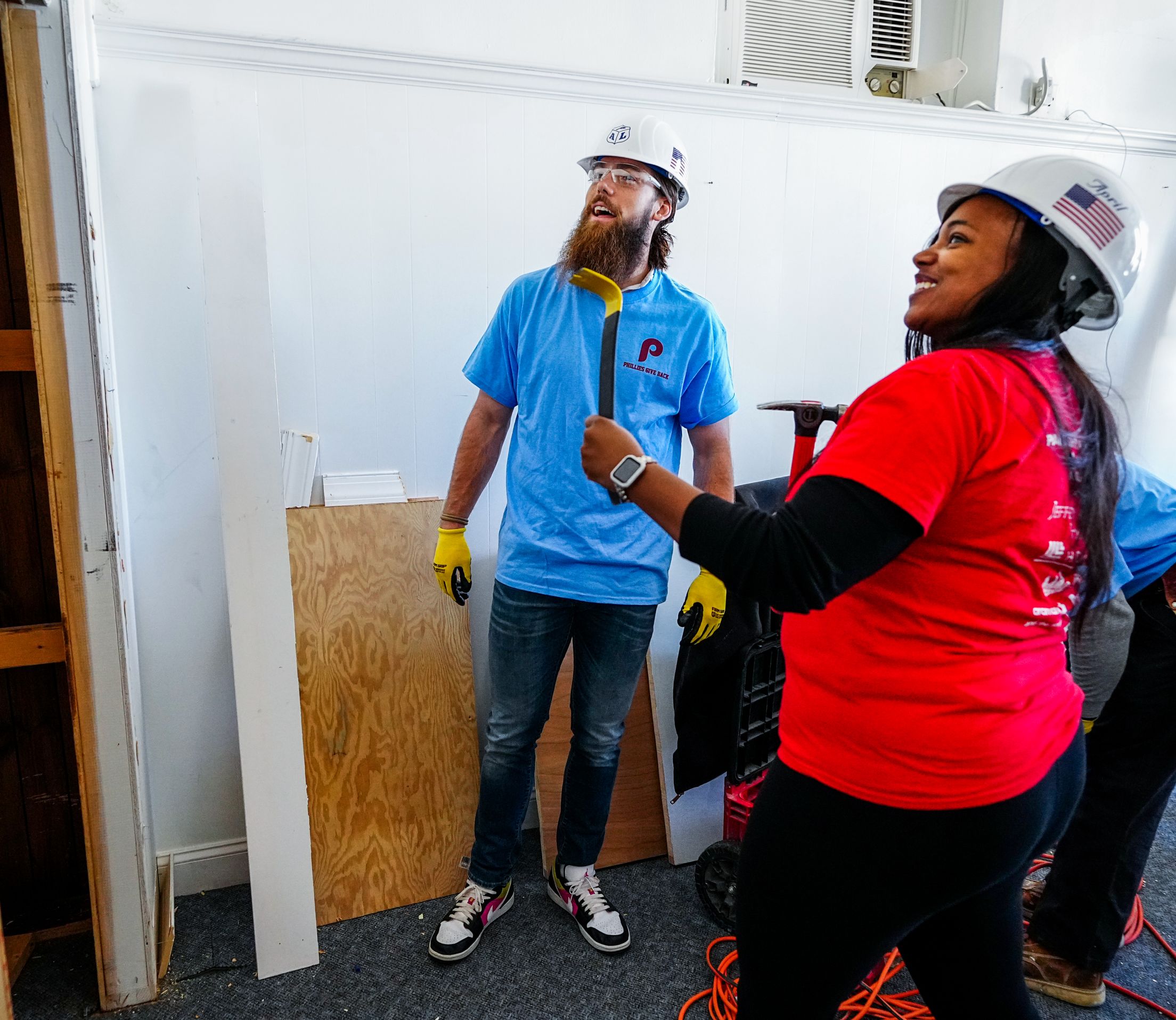 Phillies manager Rob Thomson and outfielderBrandon Marsh, along with volunteers from the Phillies front office, made a special visit to the 24th PAL Center as they joined PAL officers and kids to assist with the removal of walls, floor tile and light debris, as they help to make way for a new e-gaming room to be built this winter, created through the MLB Fall Classic Legacy Initiative.