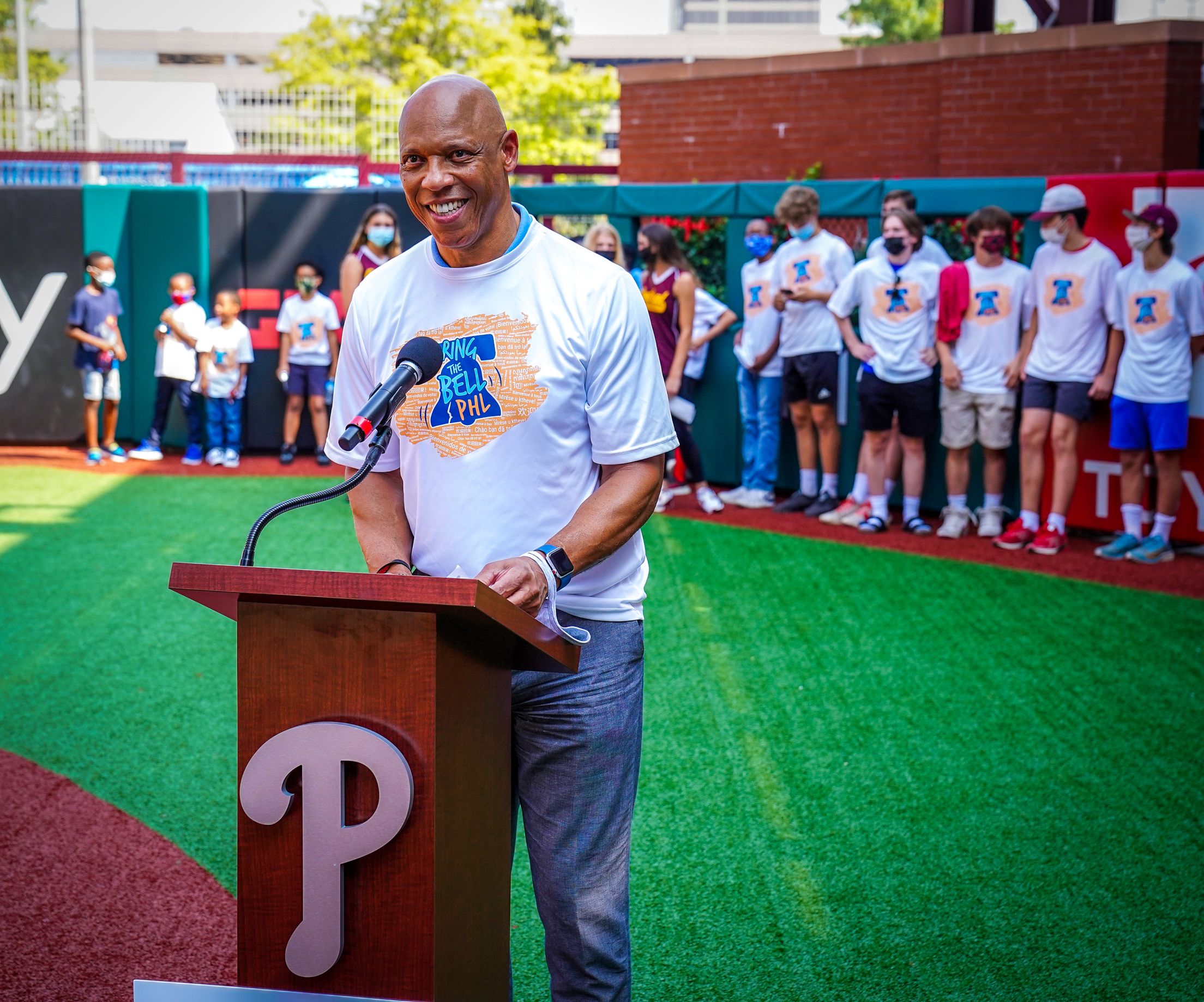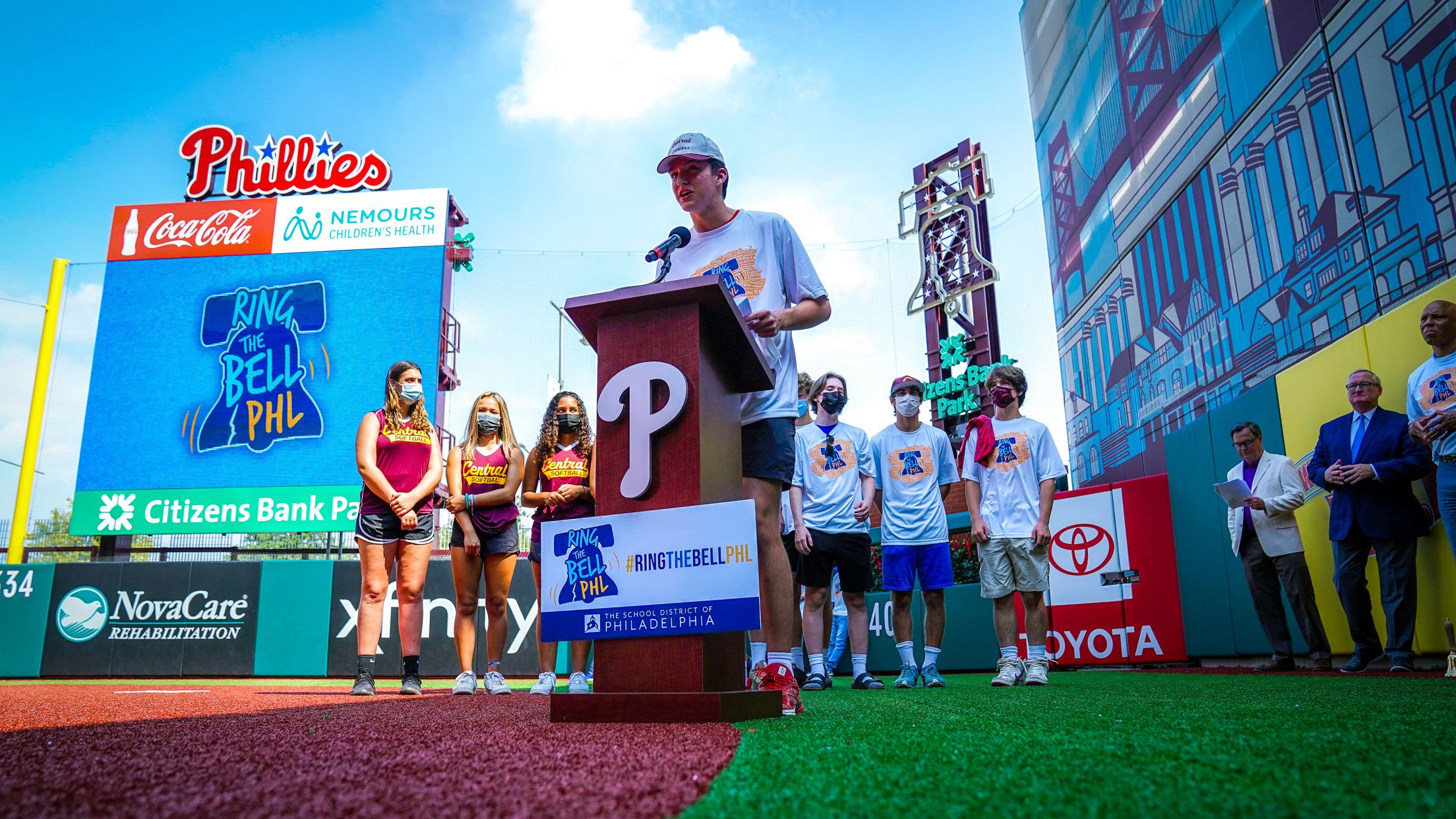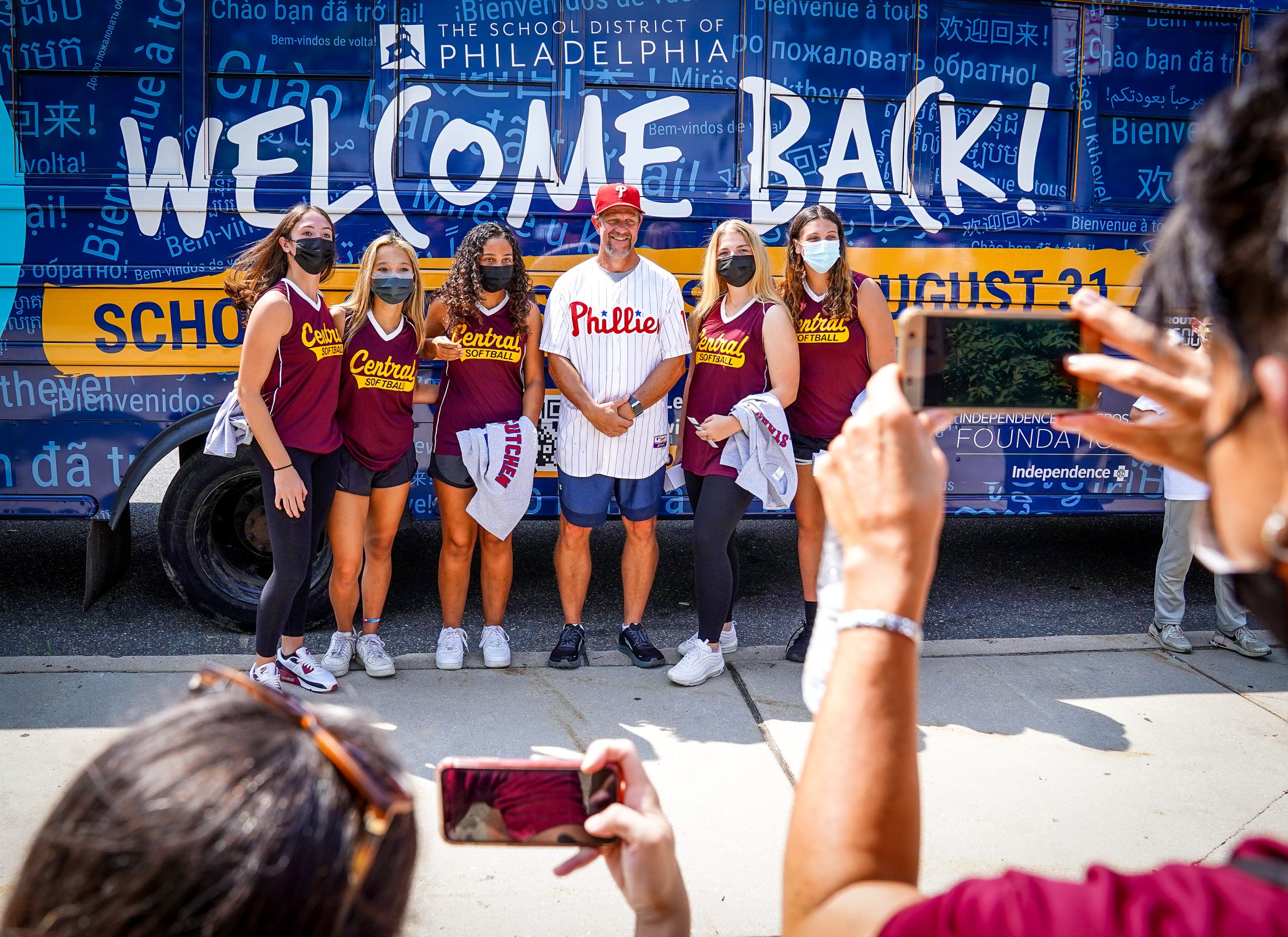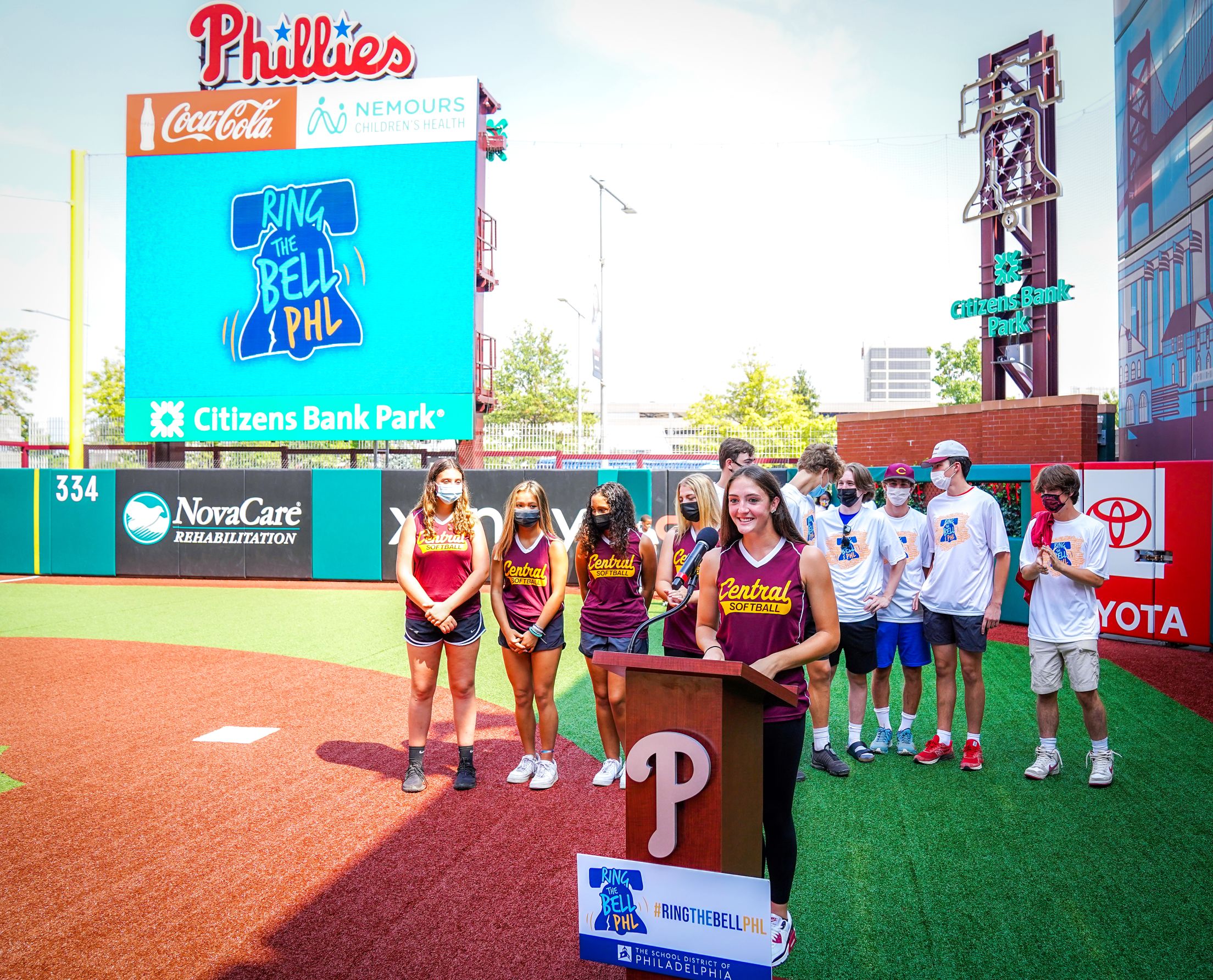 School District of Philadelphia Superintendent William R. Hite, Jr., Ed.D. was joined by Philadelphia Mayor Jim Kenney, Board of Education President Joyce Wilkerson and Philadelphia Phillies Ambassadors Scott Palmer and Mickey Morandini, as well as the Phillie Phanatic and Phillies Ballgirls, for a special back-to-school event as part of the District’s annual Ring the Bell campaign. In addition to sharing updates as the first day of school nears, Dr. Hite and others celebrated the 2021 Public League softball and baseball champions, with both teams from Central High School.