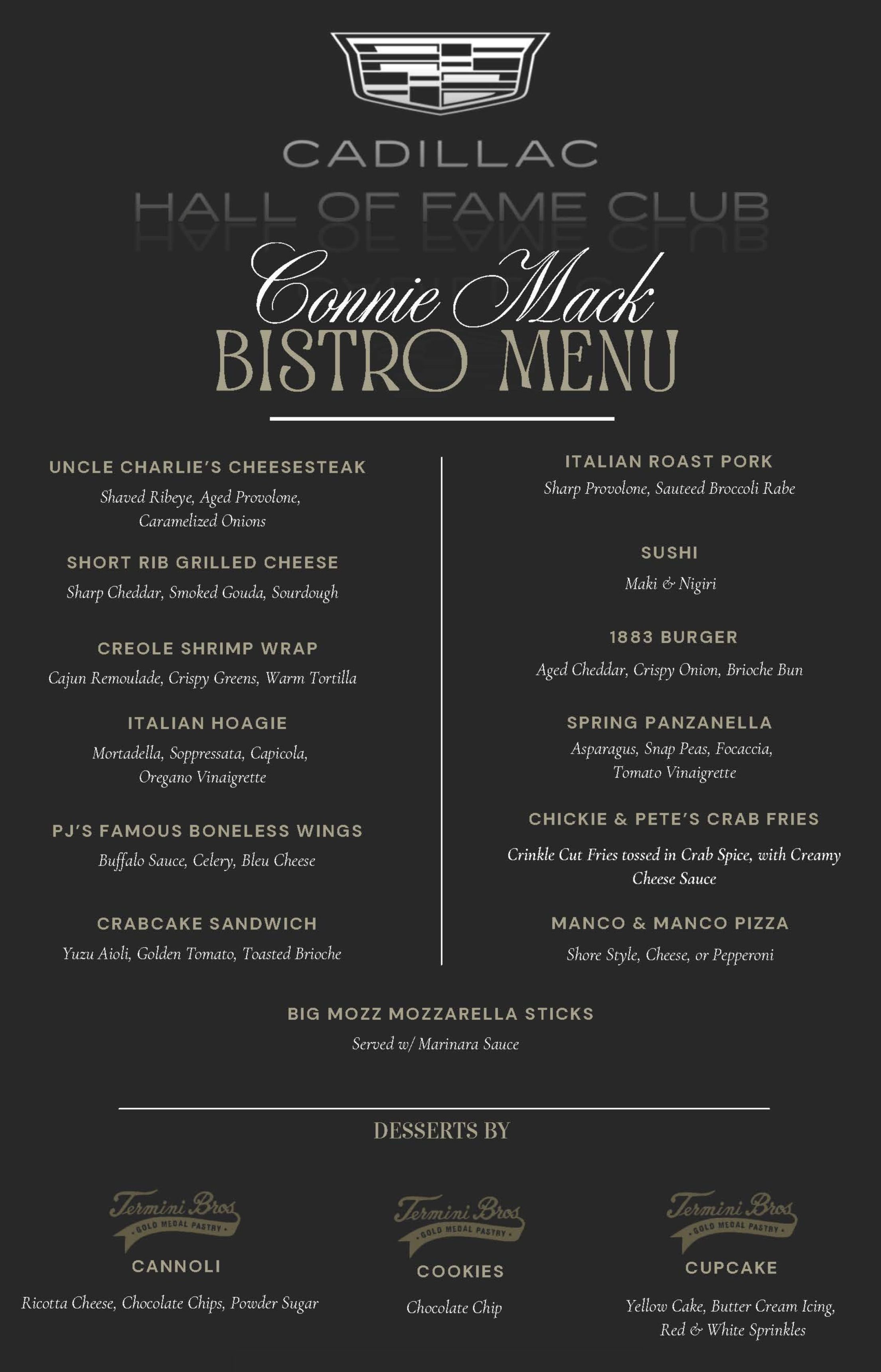 Cadillac Hall of Fame Club Concessions Menu